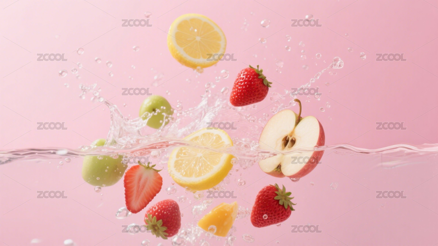 粉色背景水果落水溅起水花