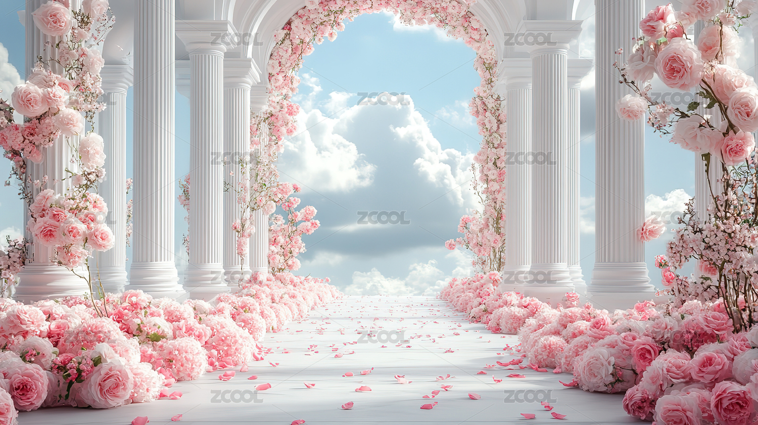 3D天空白云粉色玫瑰花朵拱门圆形产品展台