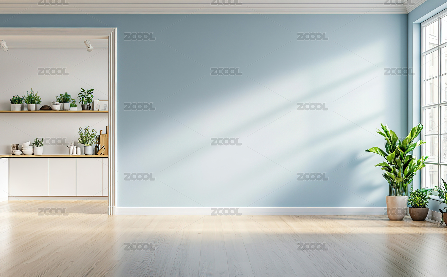 浅绿色墙面与木质地板的室内
