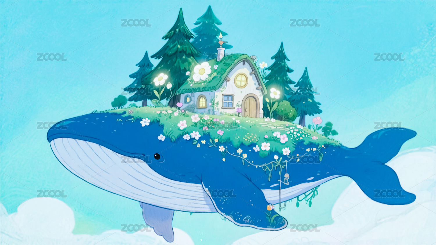 治愈系唯美插画一条蓝色的鲸鱼在遨游