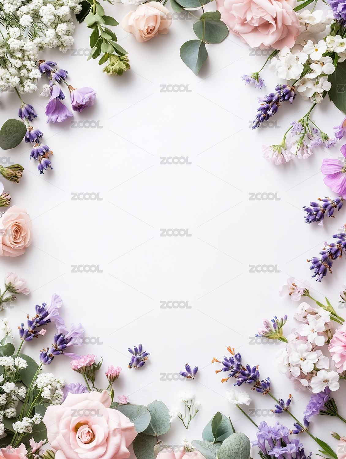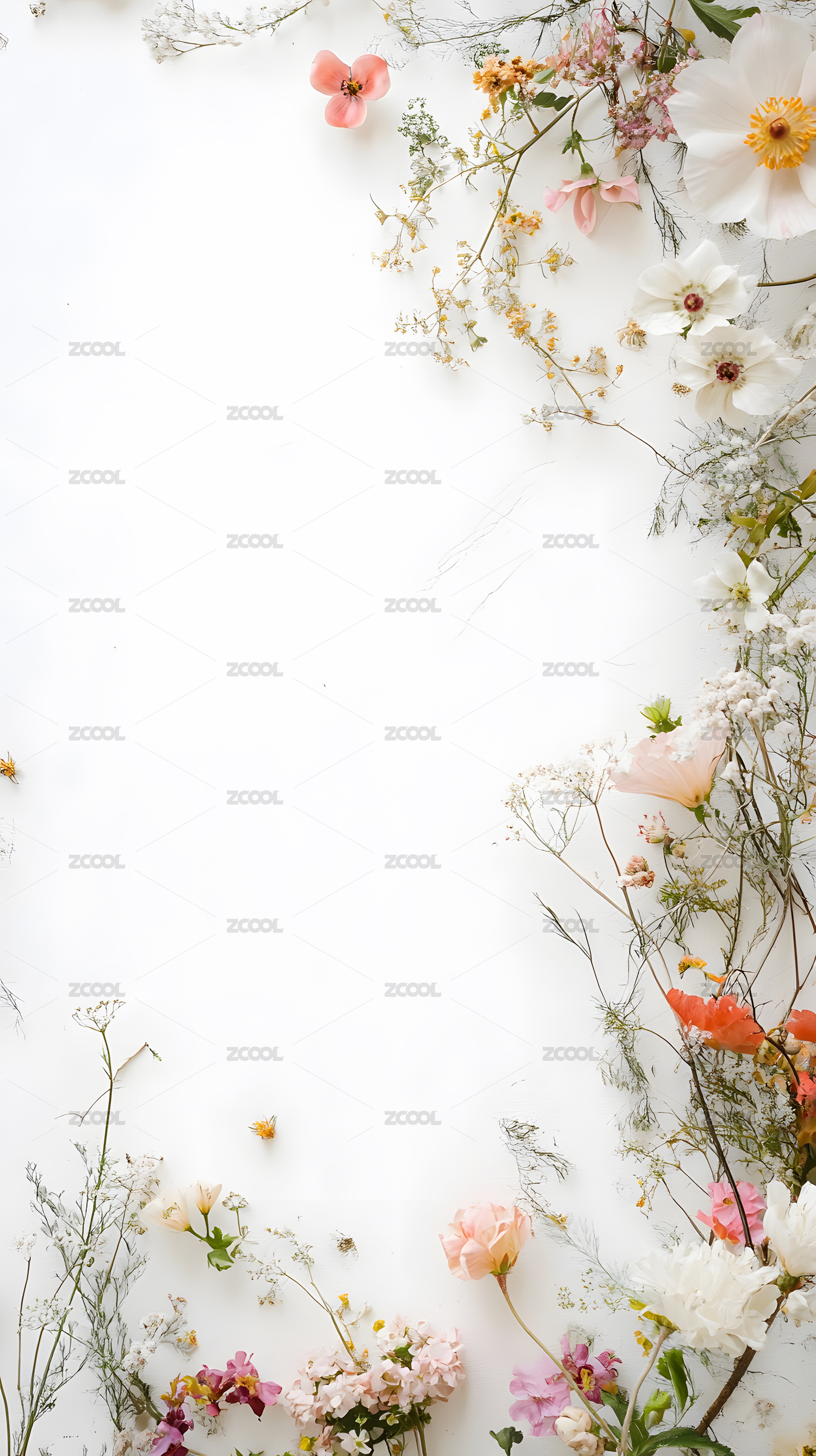白色纸板上平铺的鲜花浪漫装饰艺术背景