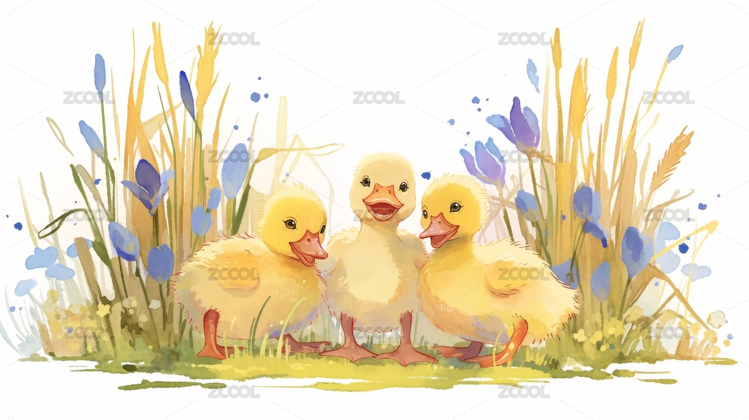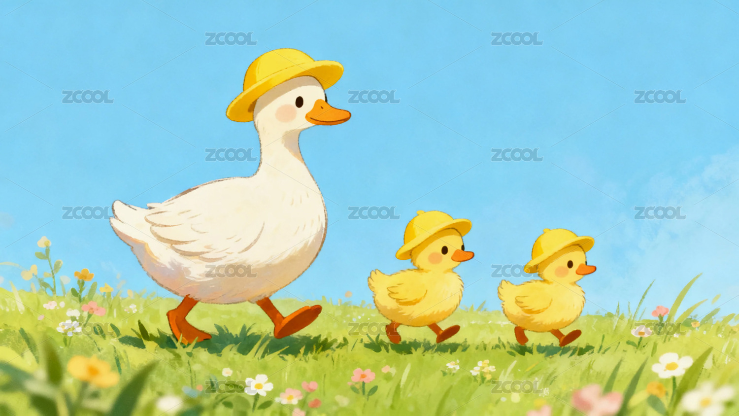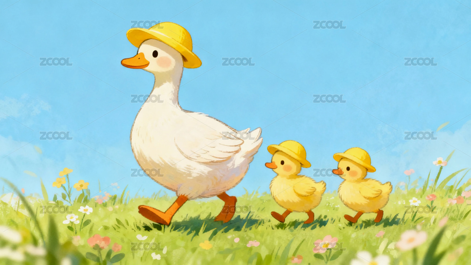 鸭妈妈和两只小鸭子治愈插画