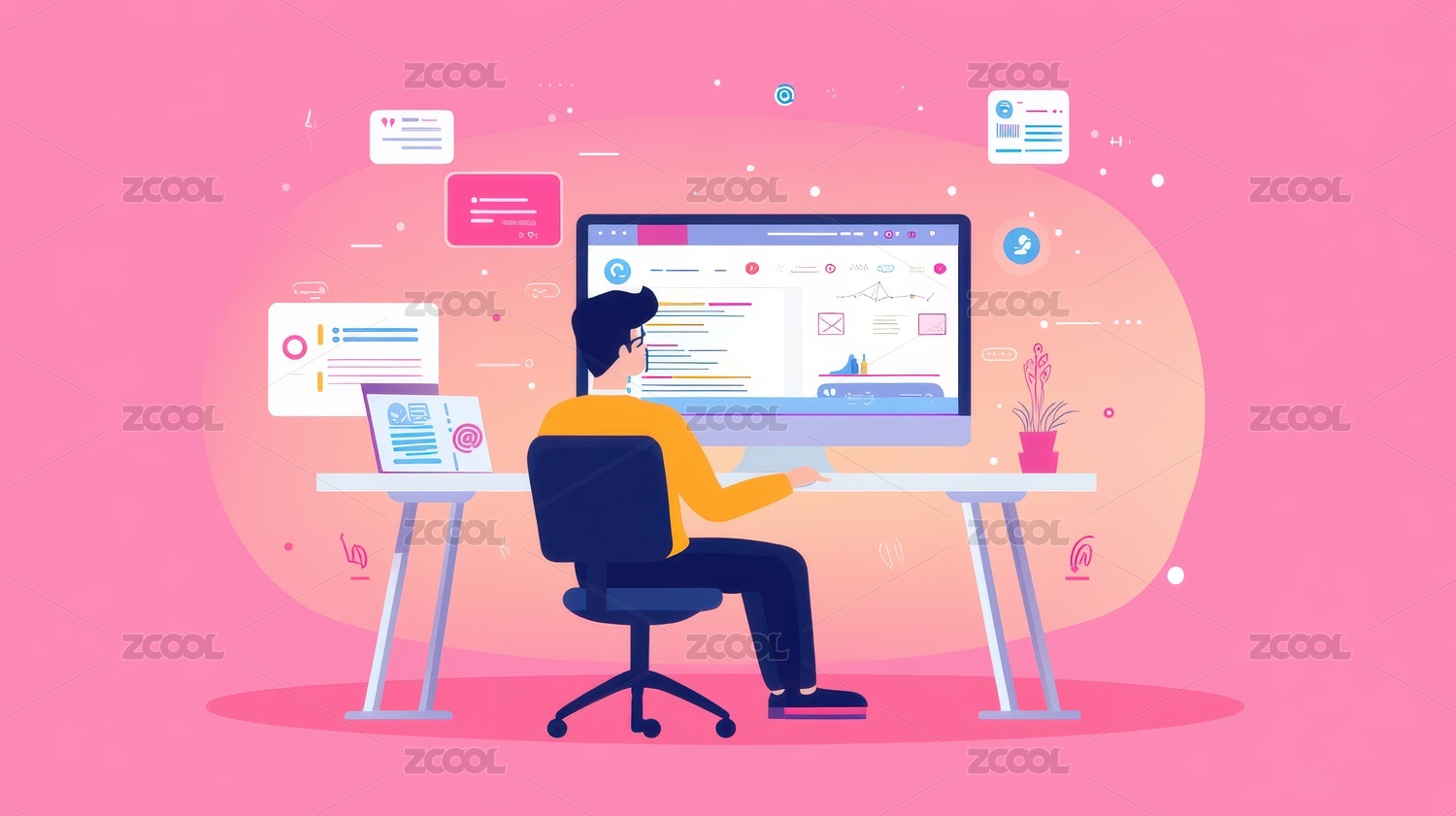 电脑,卡通,极简,创意,办公,桌面,咖啡,盆栽,现代,数据