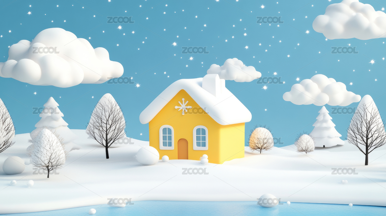 小屋,雪景,冬天,温馨,树木,云朵,蓝天,围栏