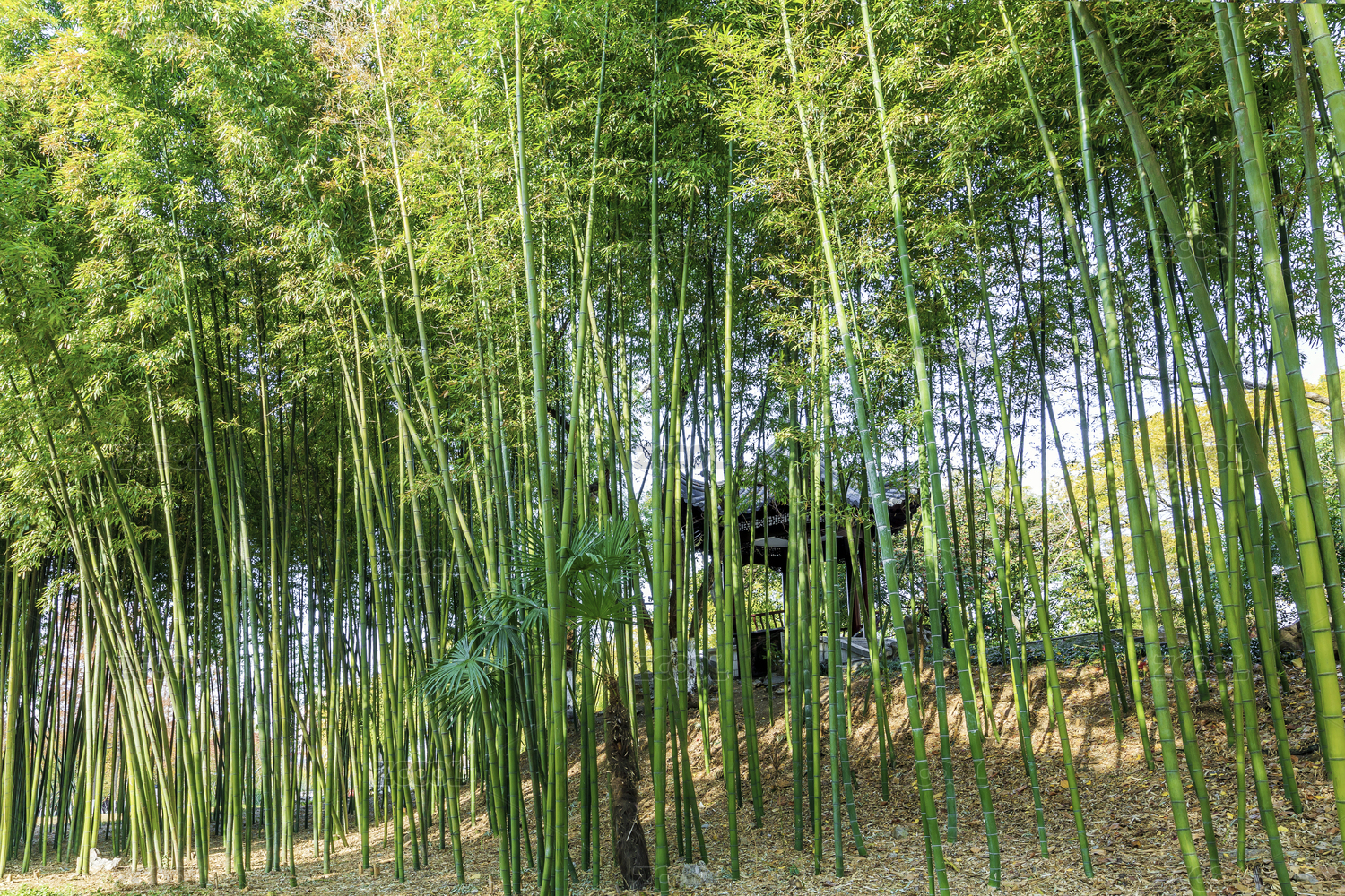 翠绿色的茂密的阳光竹林中的凉亭
