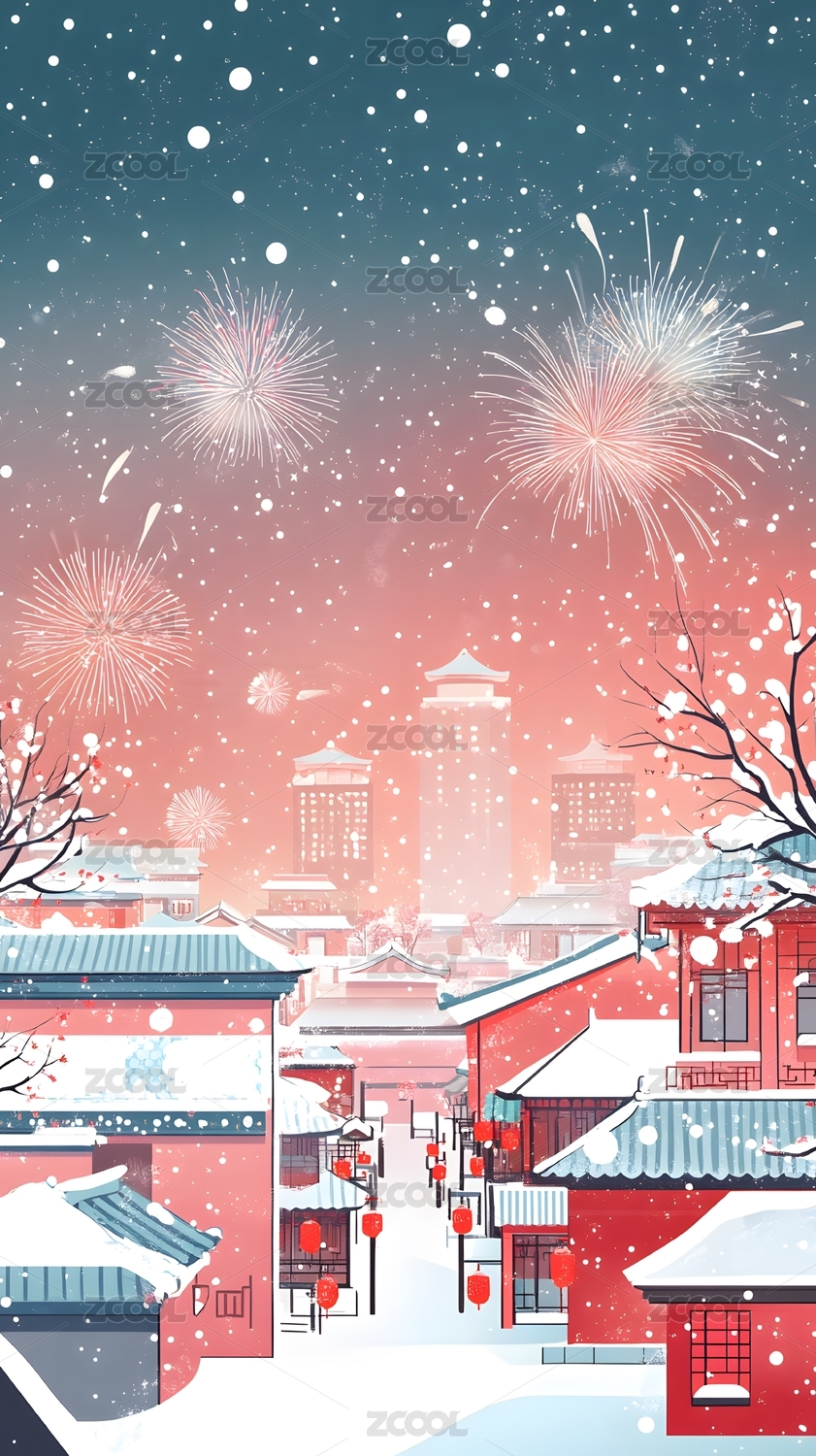 红底雪景古风建筑烟花