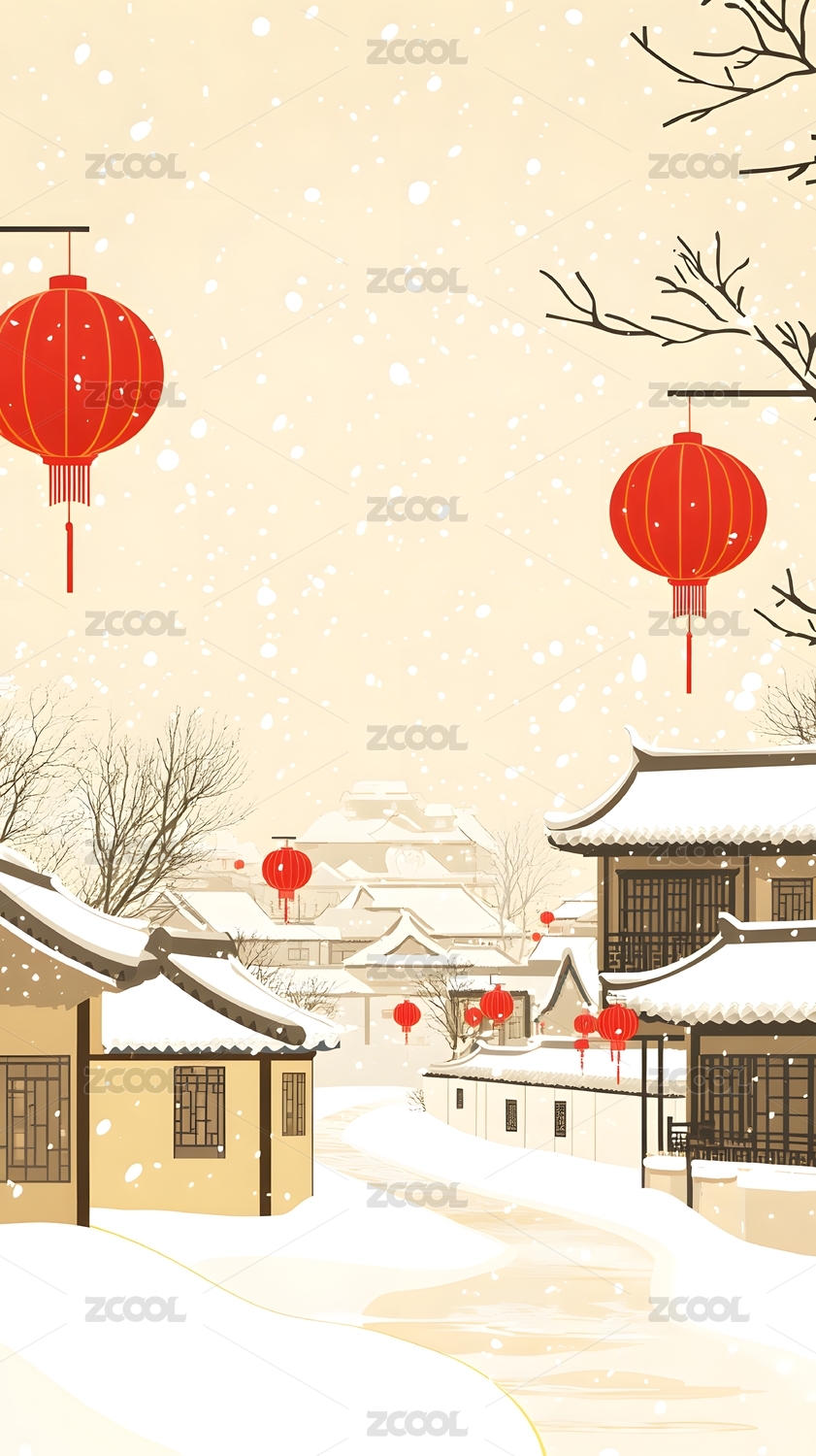 雪夜红灯笼挂满街巷