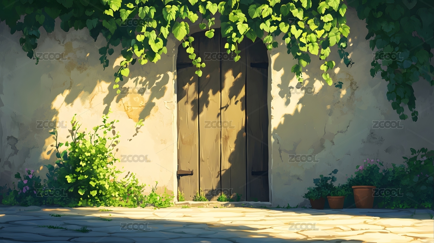 凉亭上翠绿藤蔓映衬的宁静庭院