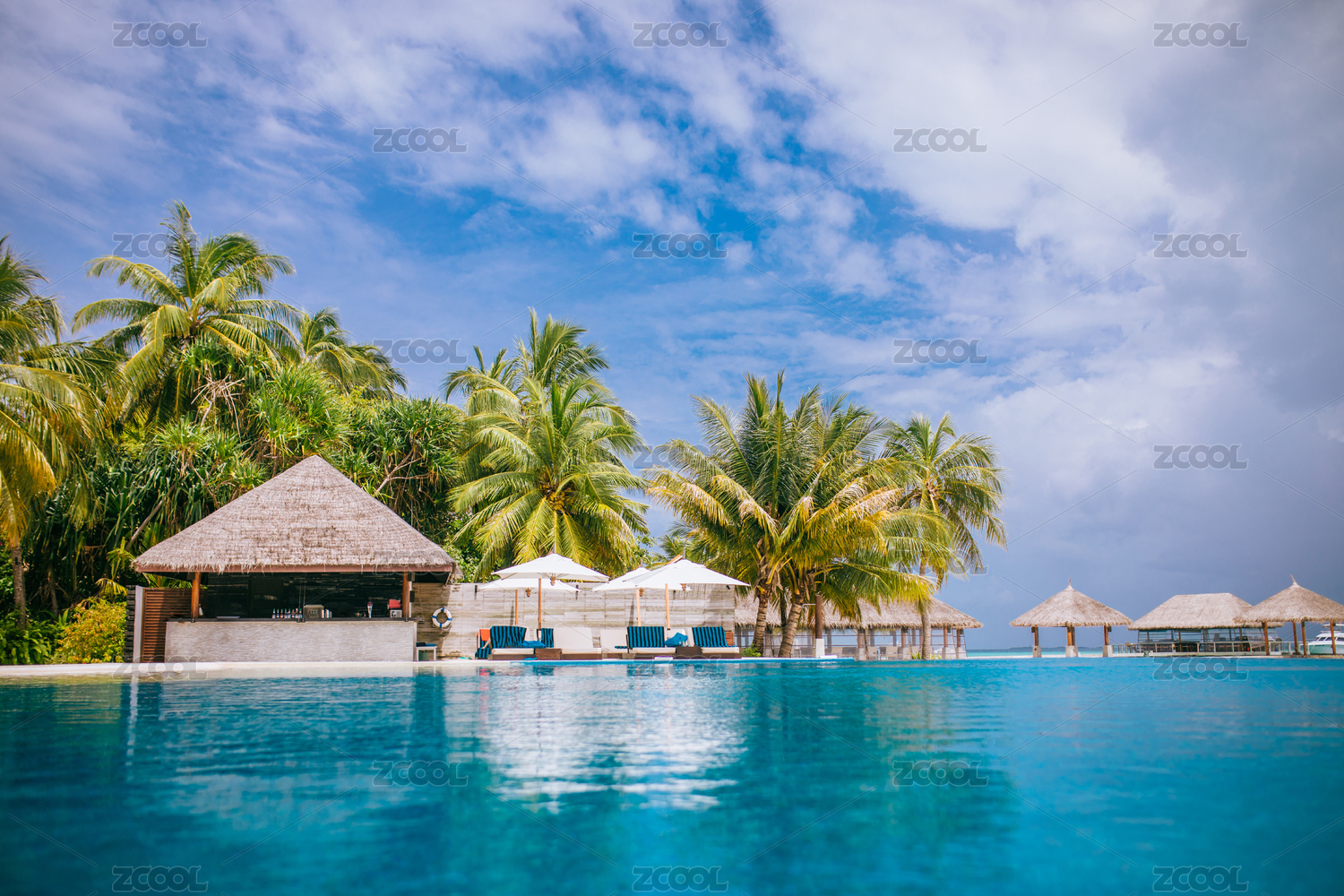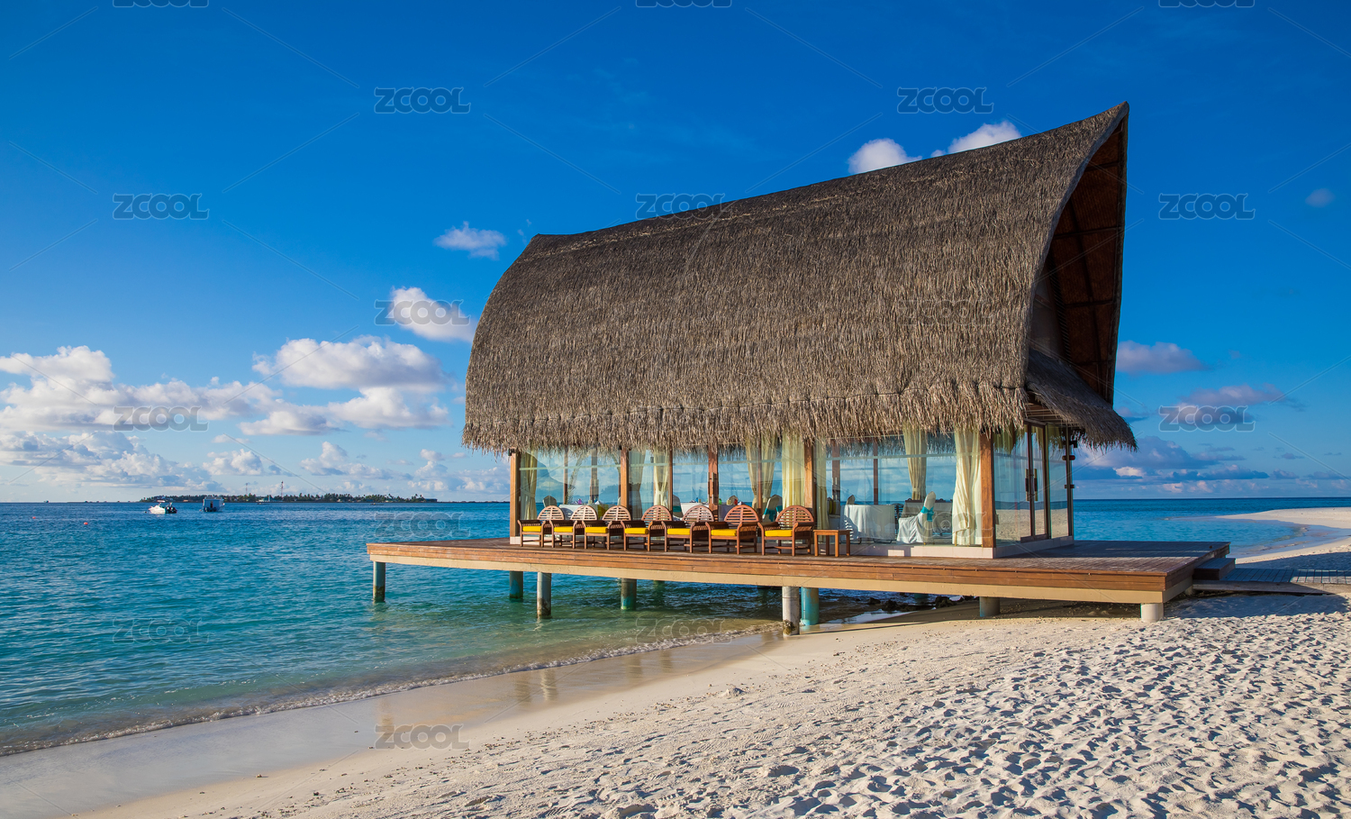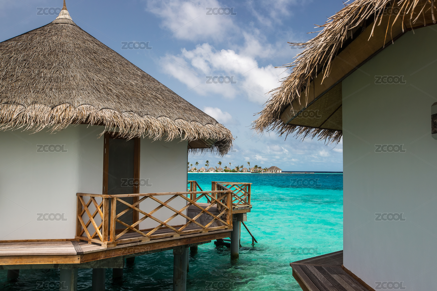 夏天晴朗天气下碧海蓝天的马尔代夫宁静岛度假酒店水屋