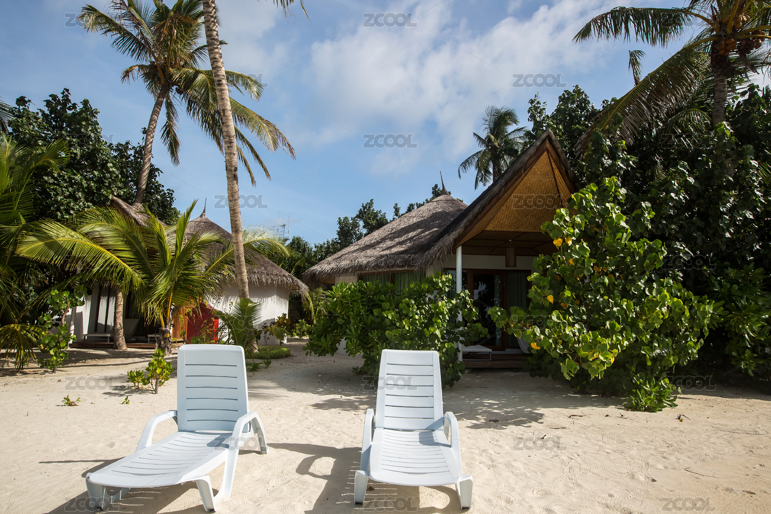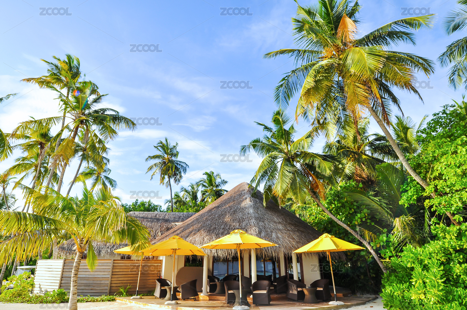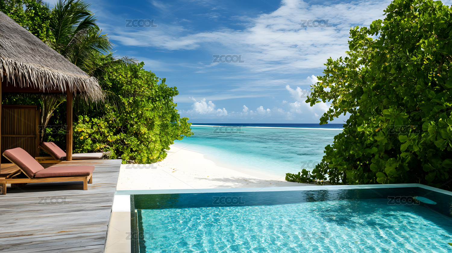 夏天晴朗天气下碧海蓝天的马尔代夫宁静岛度假酒店水屋