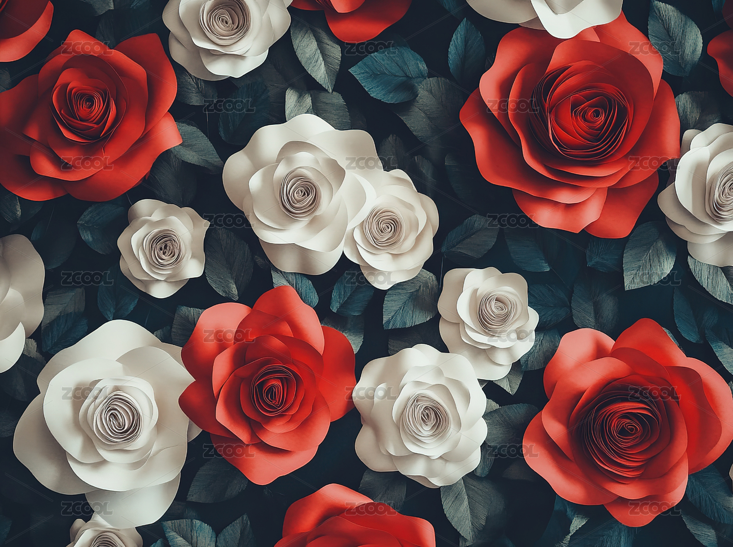 3D多层纸雕红玫瑰花朵图案无缝平铺背景