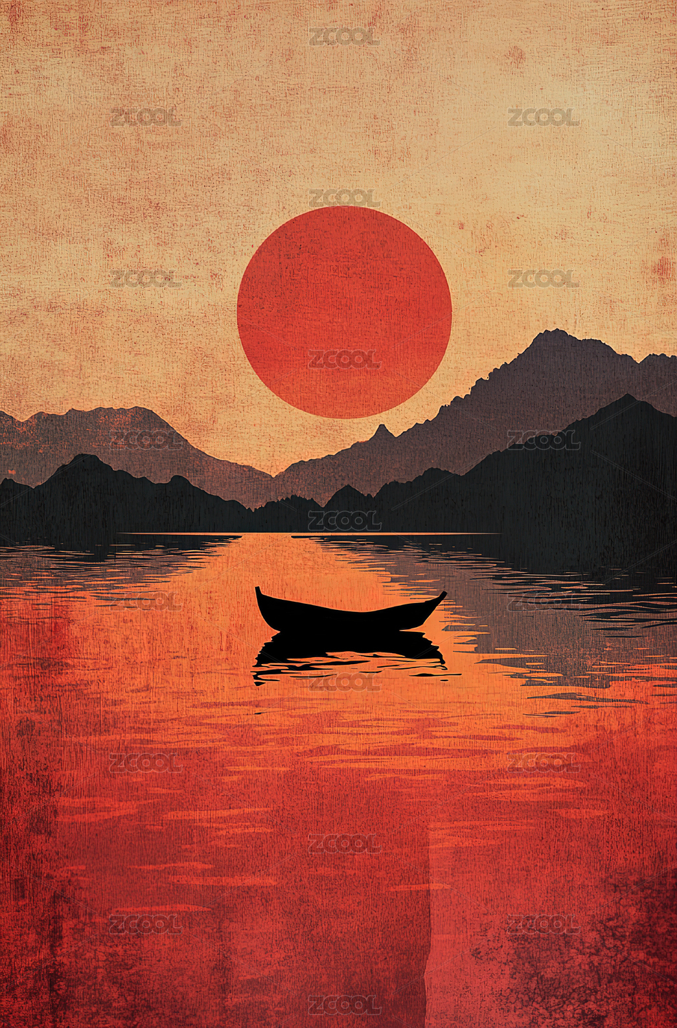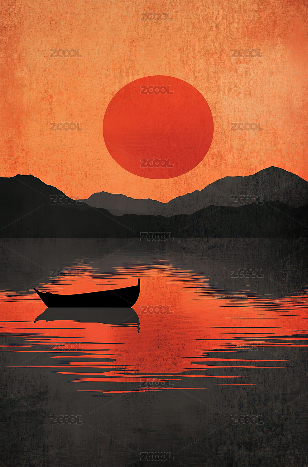 湖光山色的静谧黄昏 孤舟伴落日的诗意