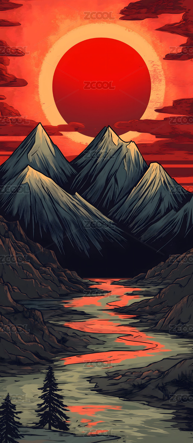 水彩,红色,粉色,白色,山,几何,绘画,水墨画,艺术,亚洲
