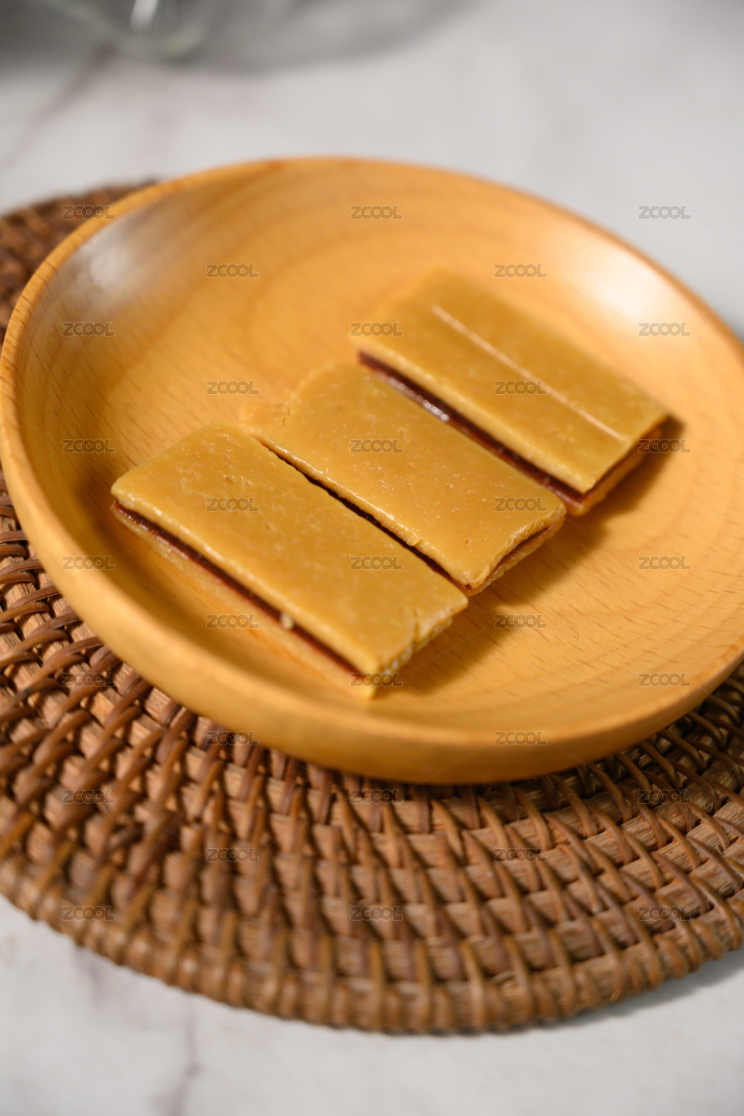 桌面上的盘子里的美味可口的夹心山楂奶糕