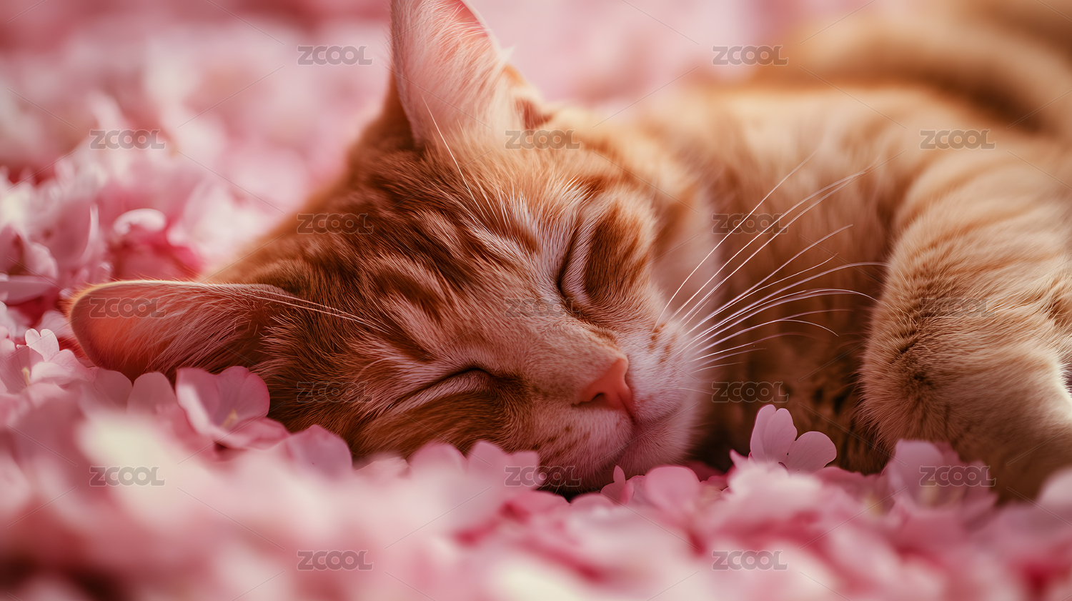 橘猫在粉色花瓣中熟睡
