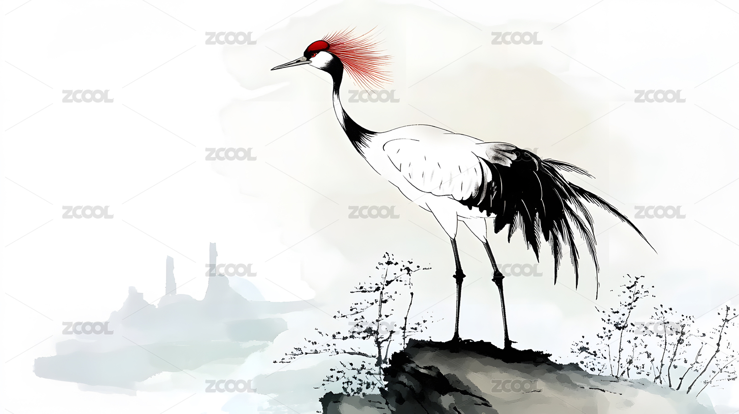 水墨风格丹顶鹤立山水间