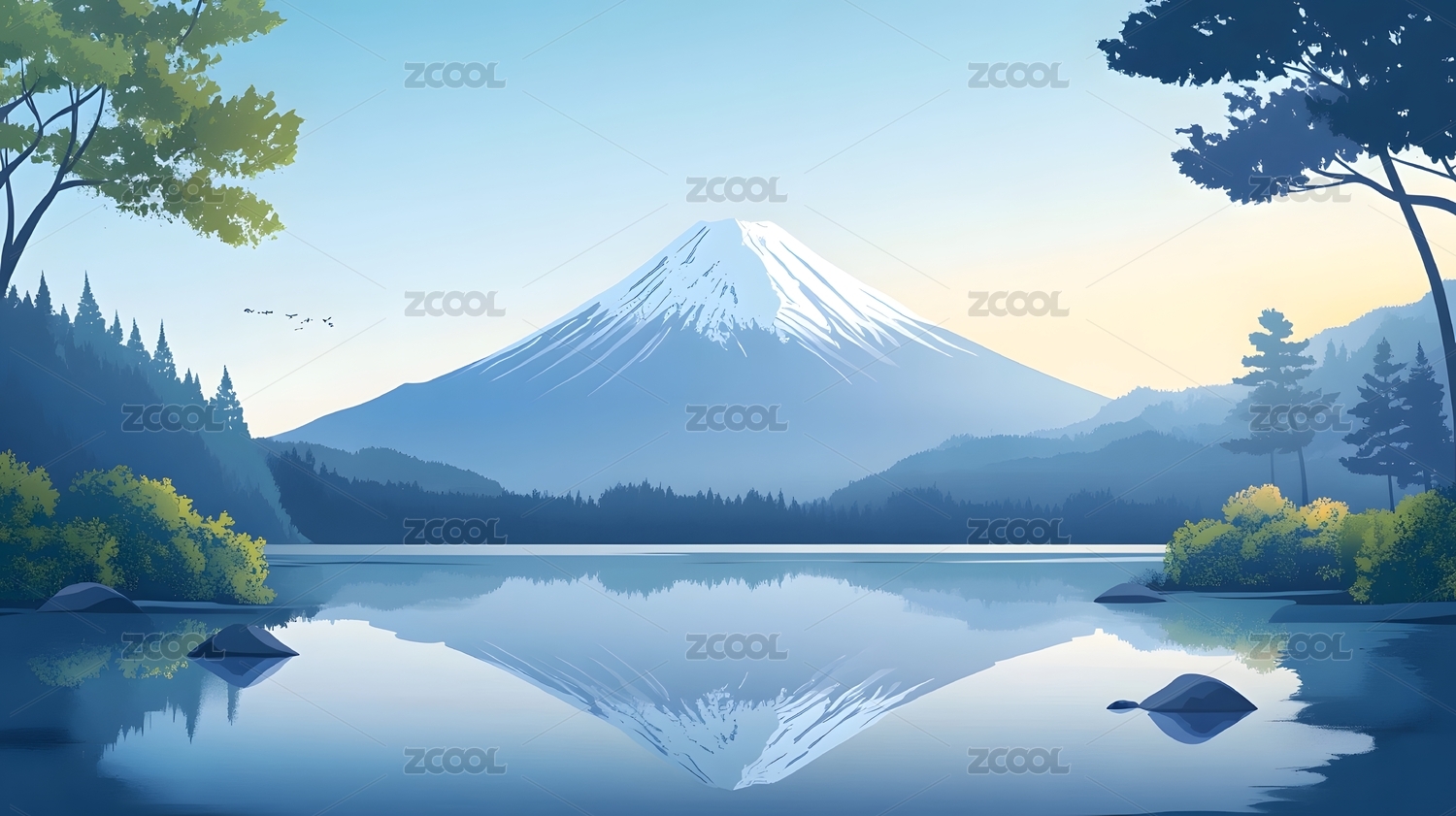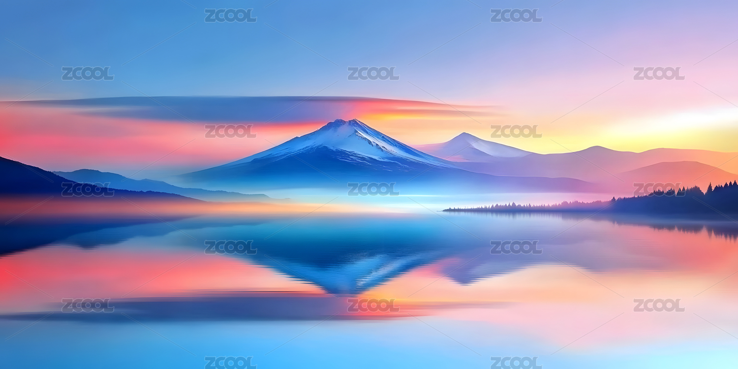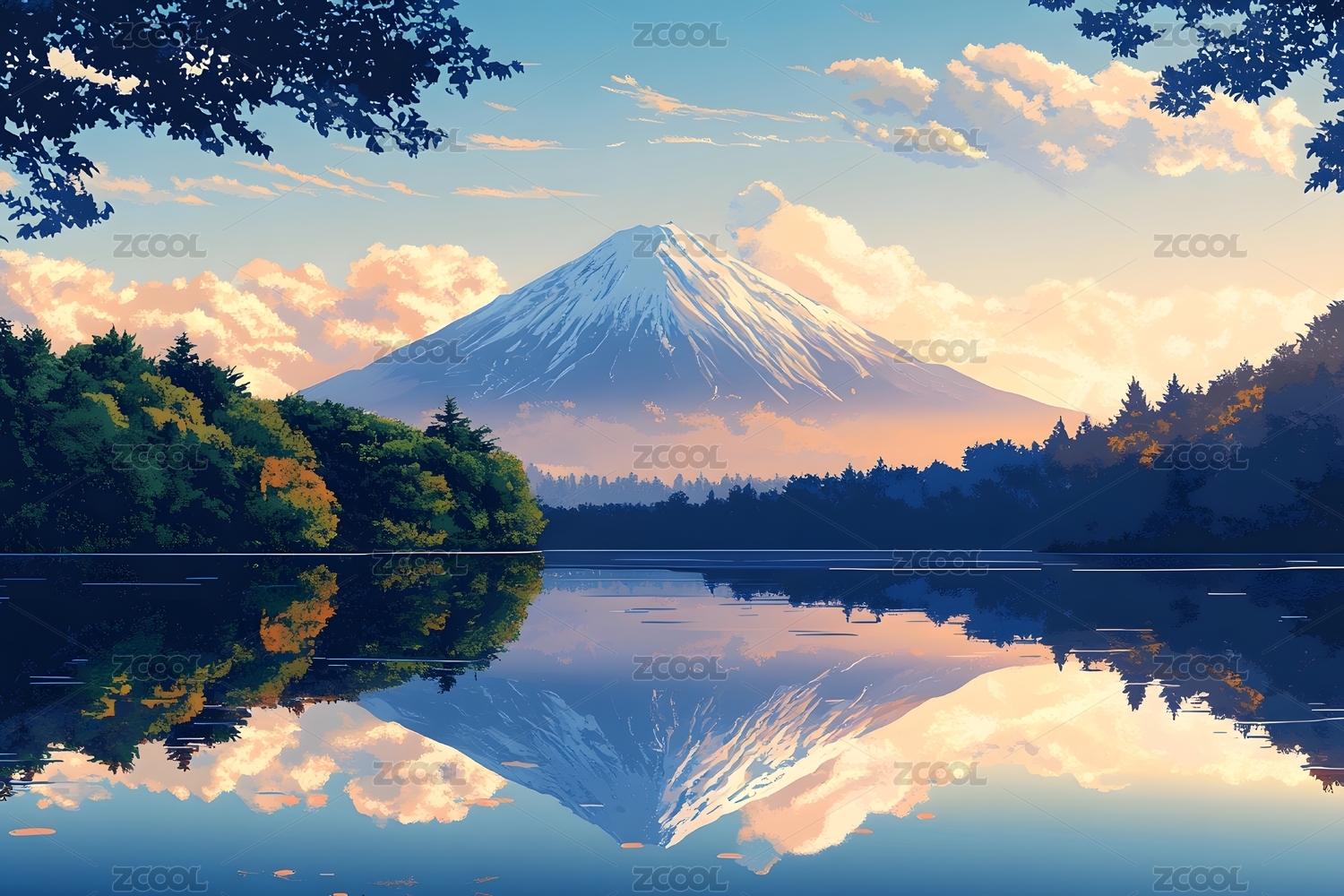 粉色, 山脉, 橙色,富士山, 日落, 湖泊, 倒影, 晚霞, 山水画,唯美