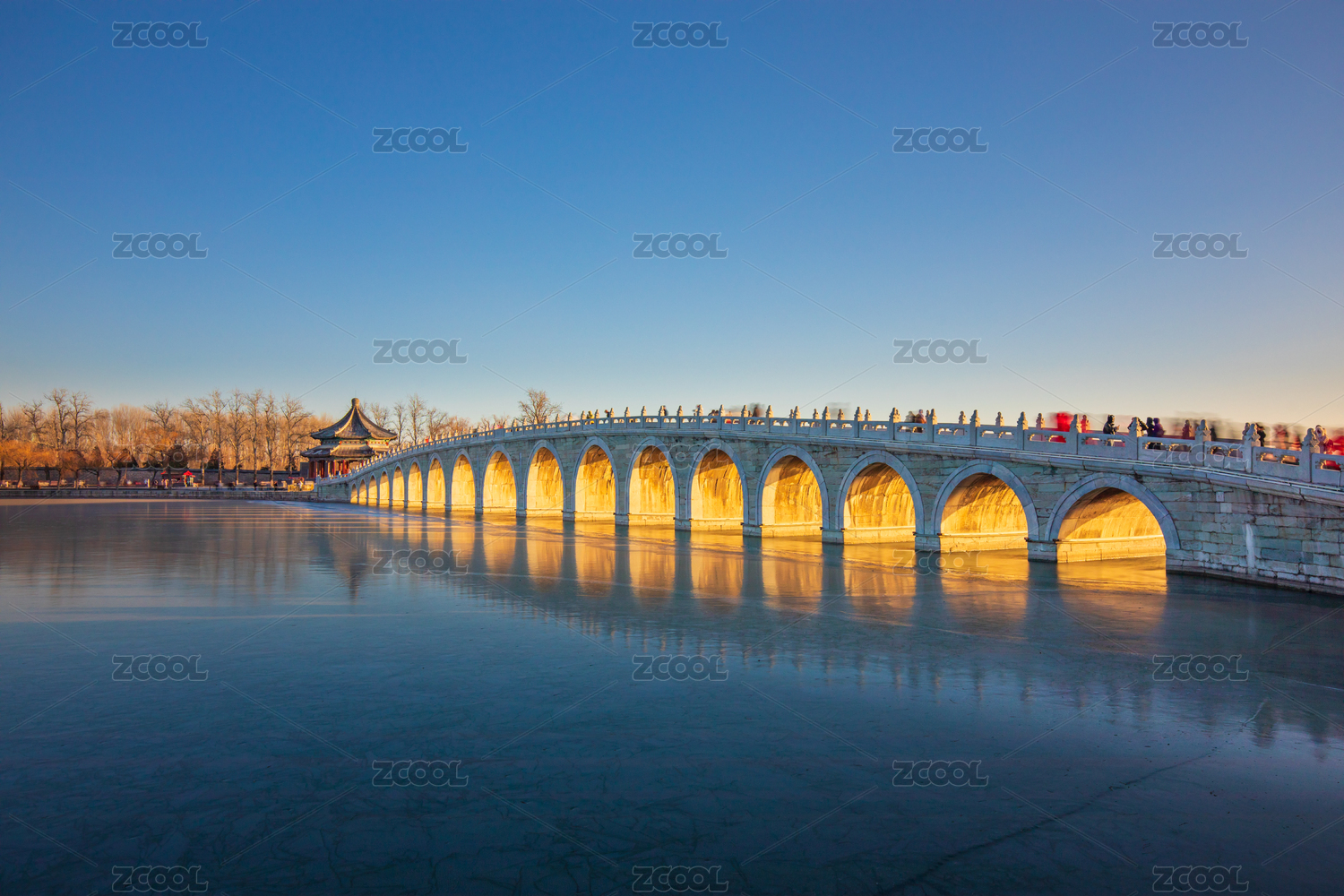 中国北京颐和园冬至黄昏十七孔桥金光穿洞风光