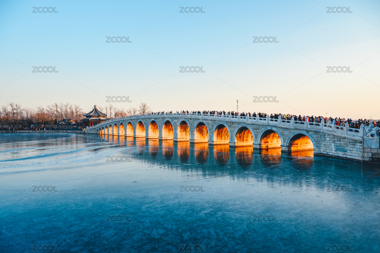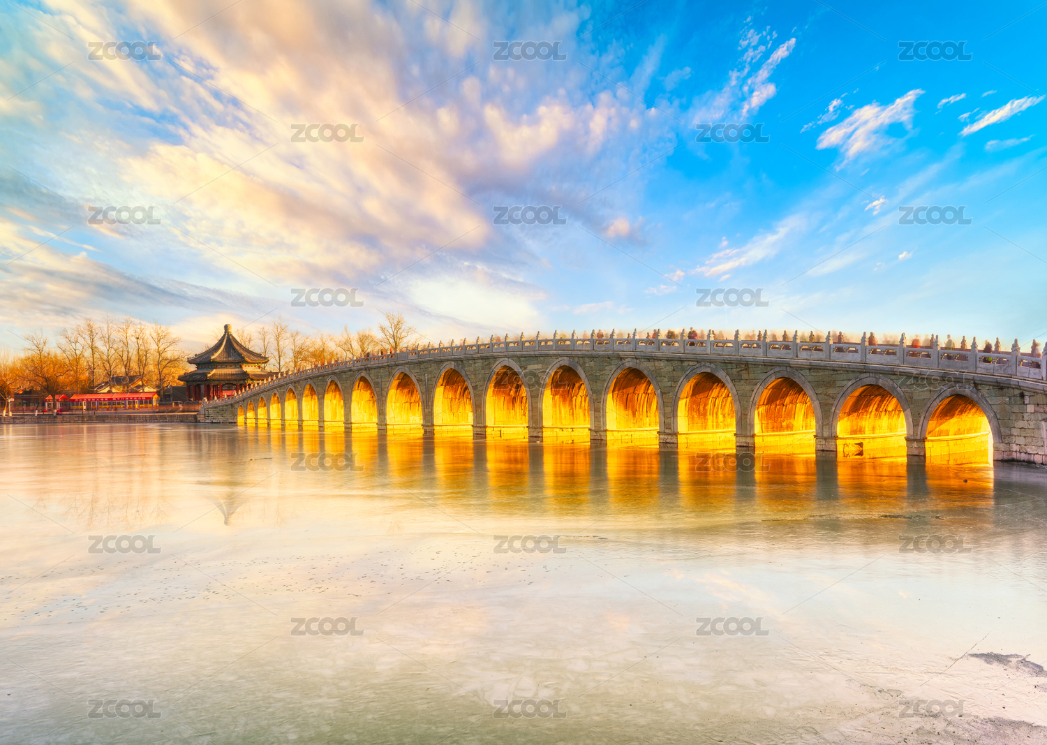 冬至前后日落照亮北京颐和园十七孔桥桥洞