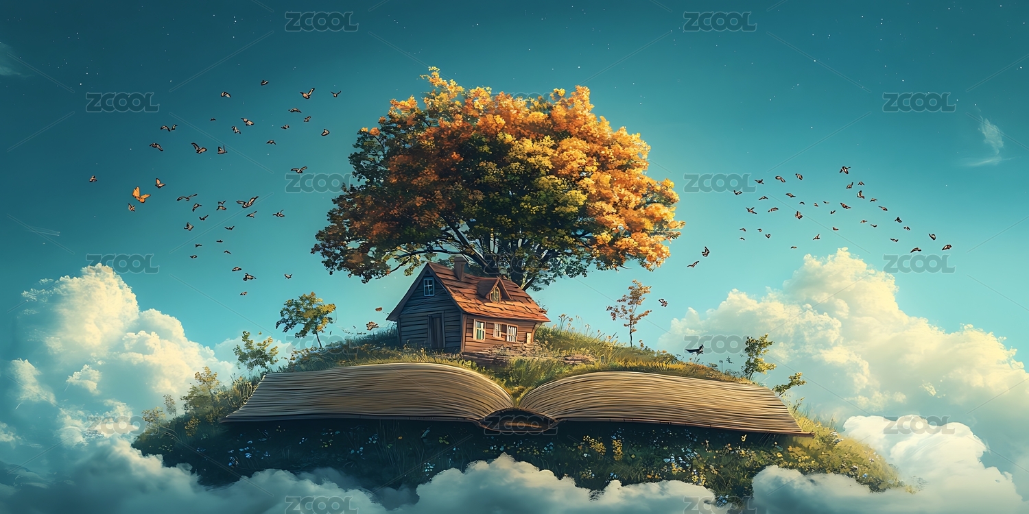 白色,山峰,梦幻,云朵,风景,创作,仙境,奇幻,绿色,书本