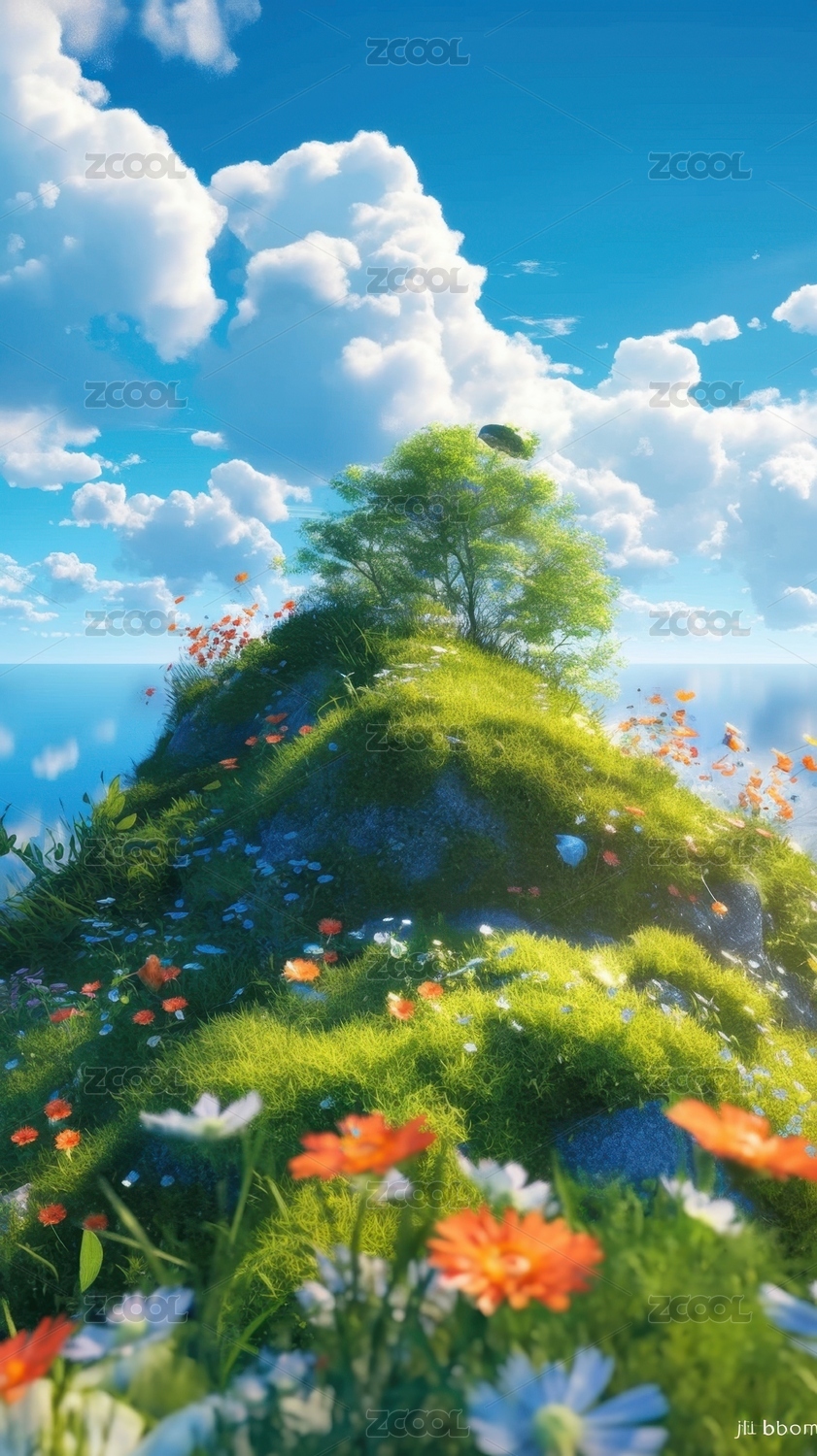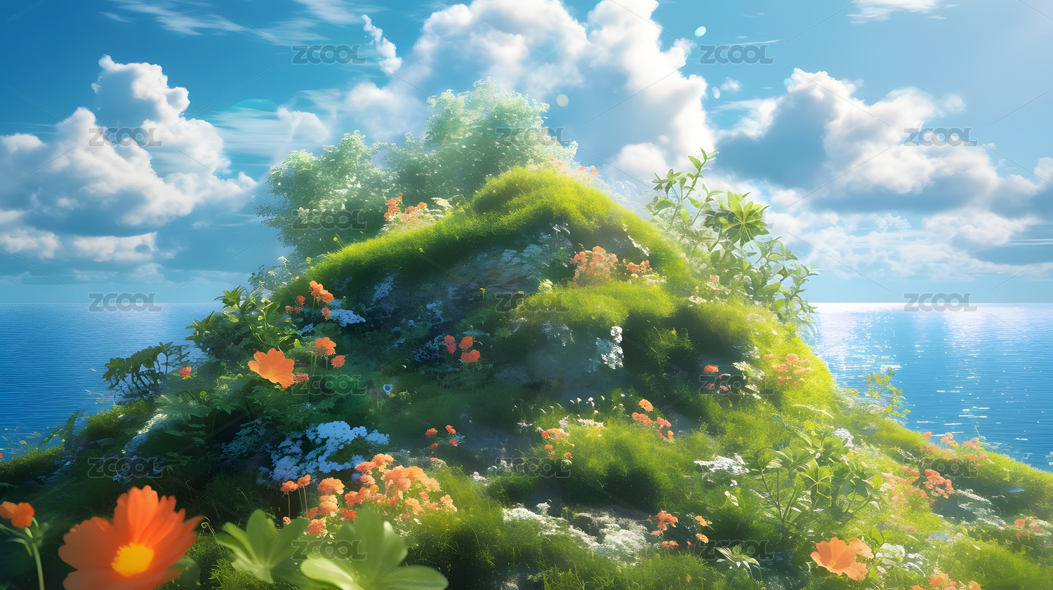 海边春日蓬勃花草小岛