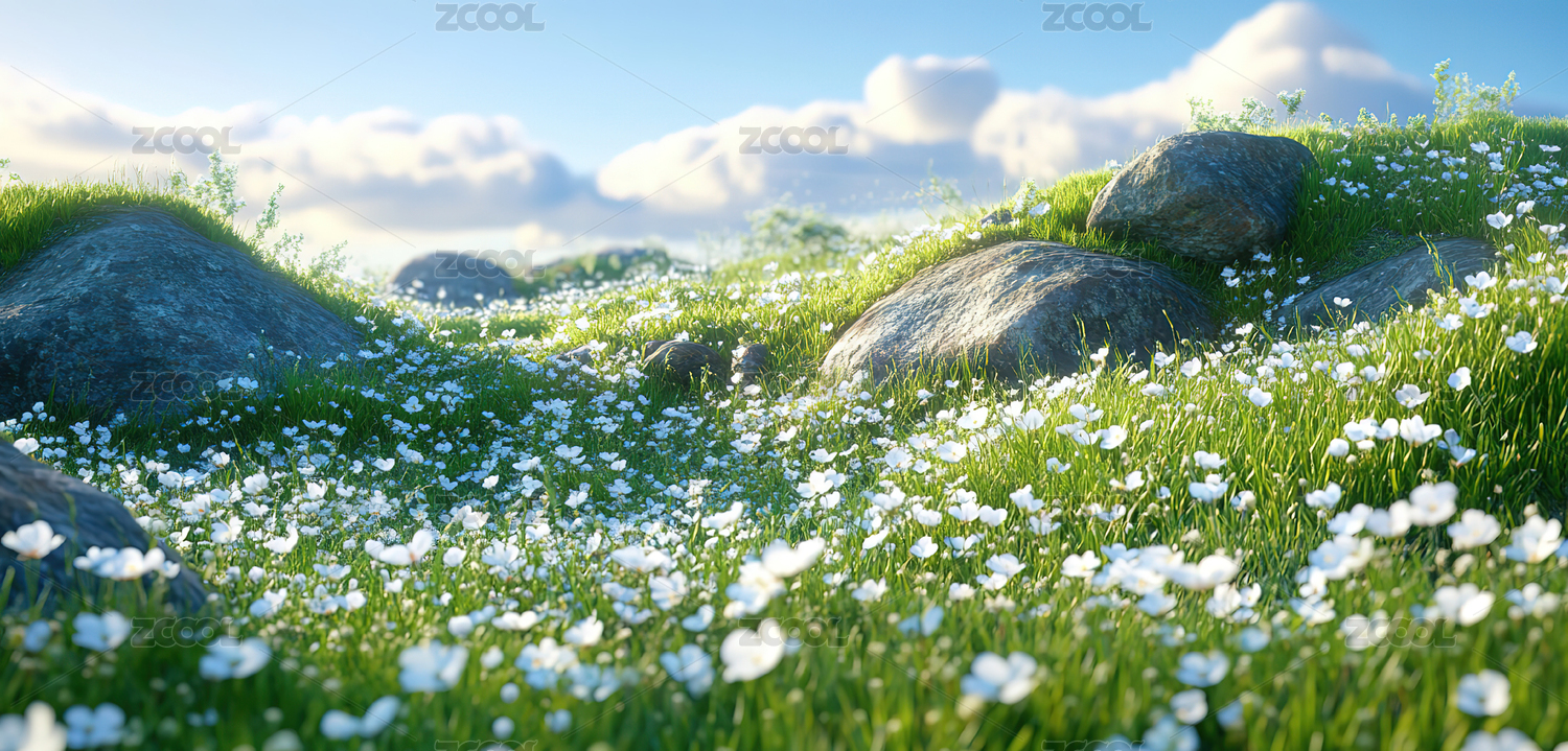 蓝天白云下的草原山坡和盛开的野花