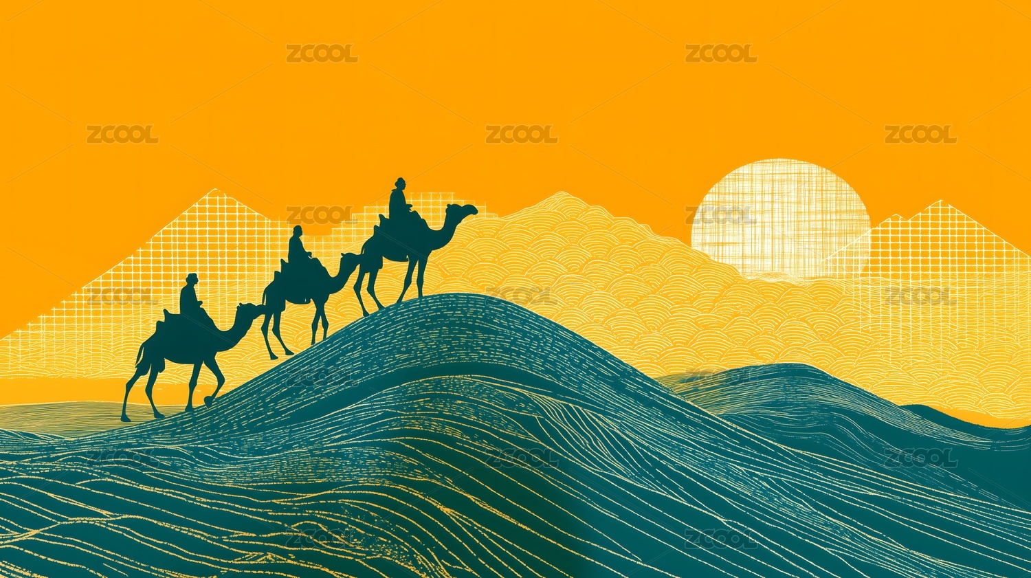金色沙漠和行走的骆驼队,丝绸之路插画