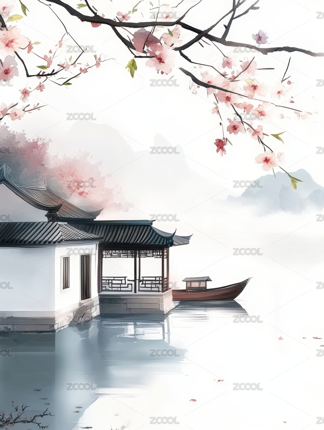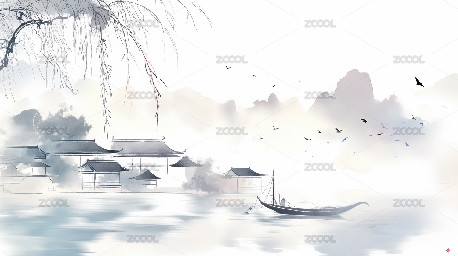 线条,人物,水墨画,风景画,古建筑,小船,山峰,树枝,飞鸟,湖泊