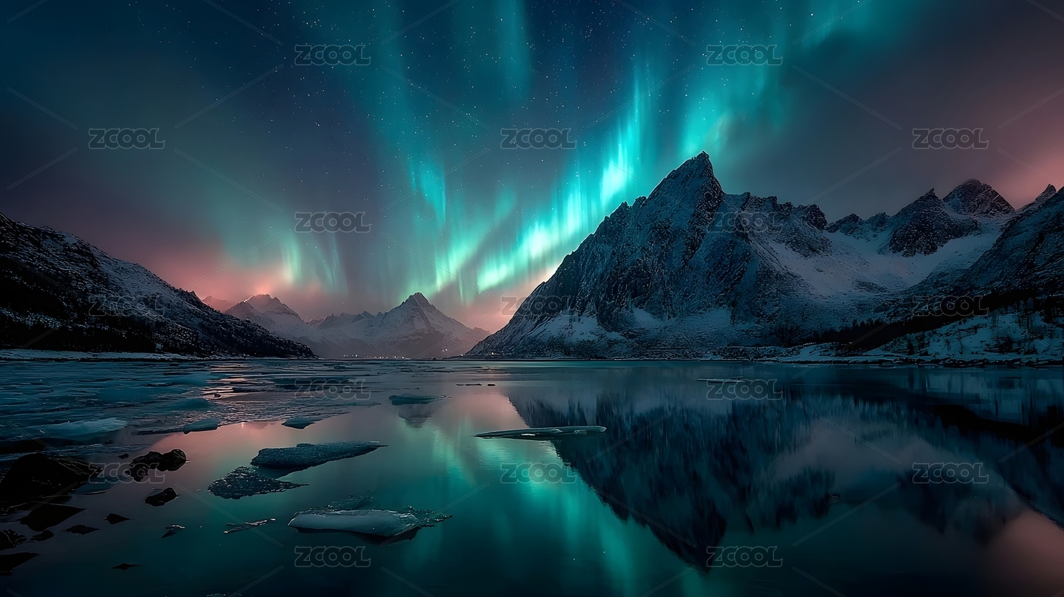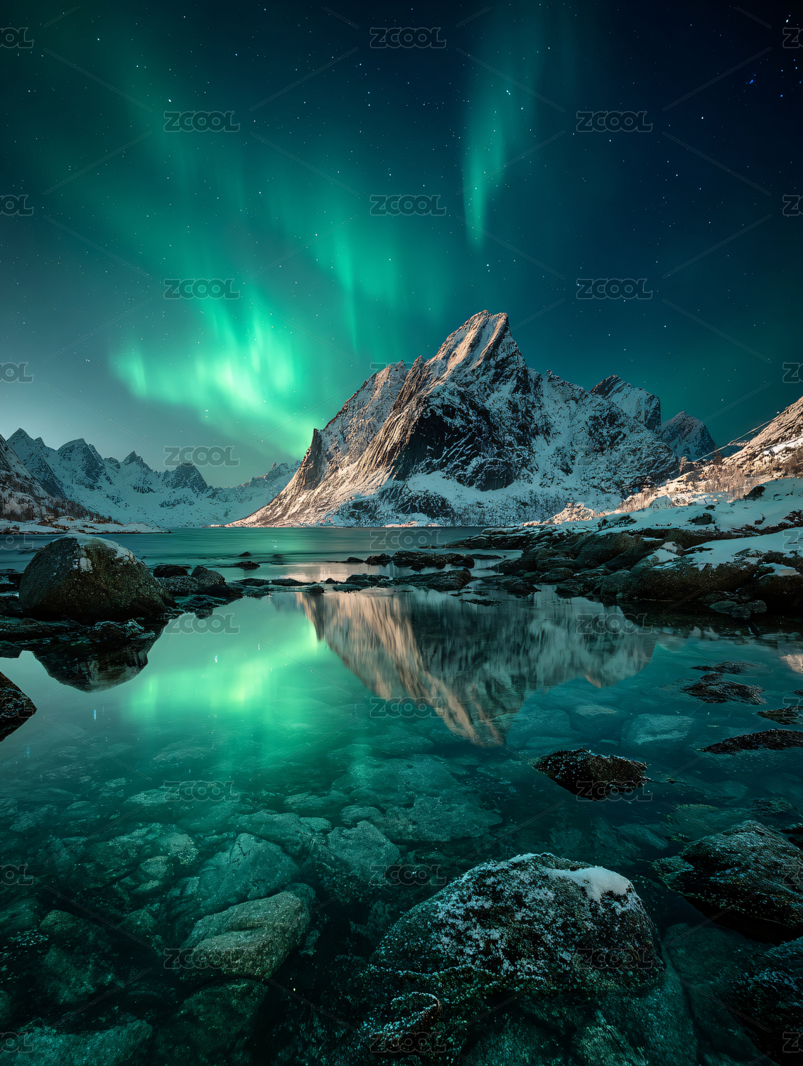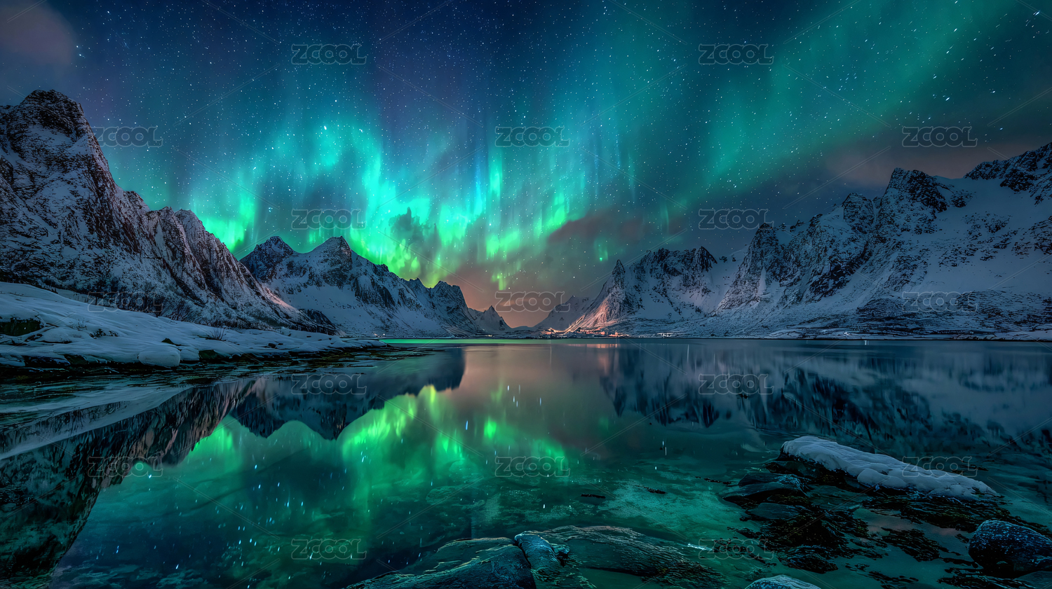 雪山极光星空水面倒影