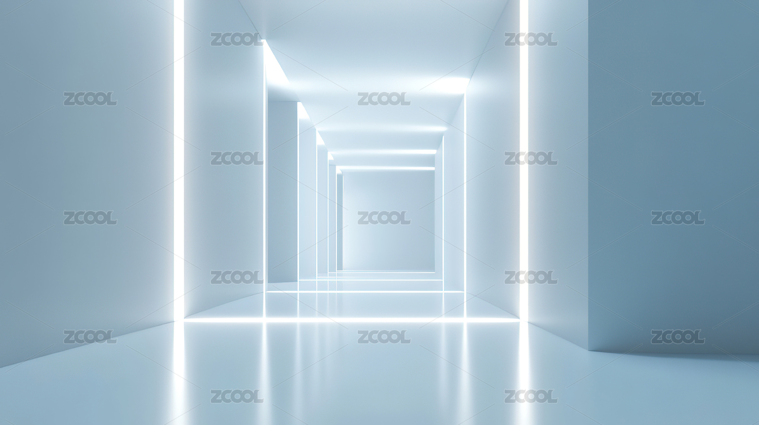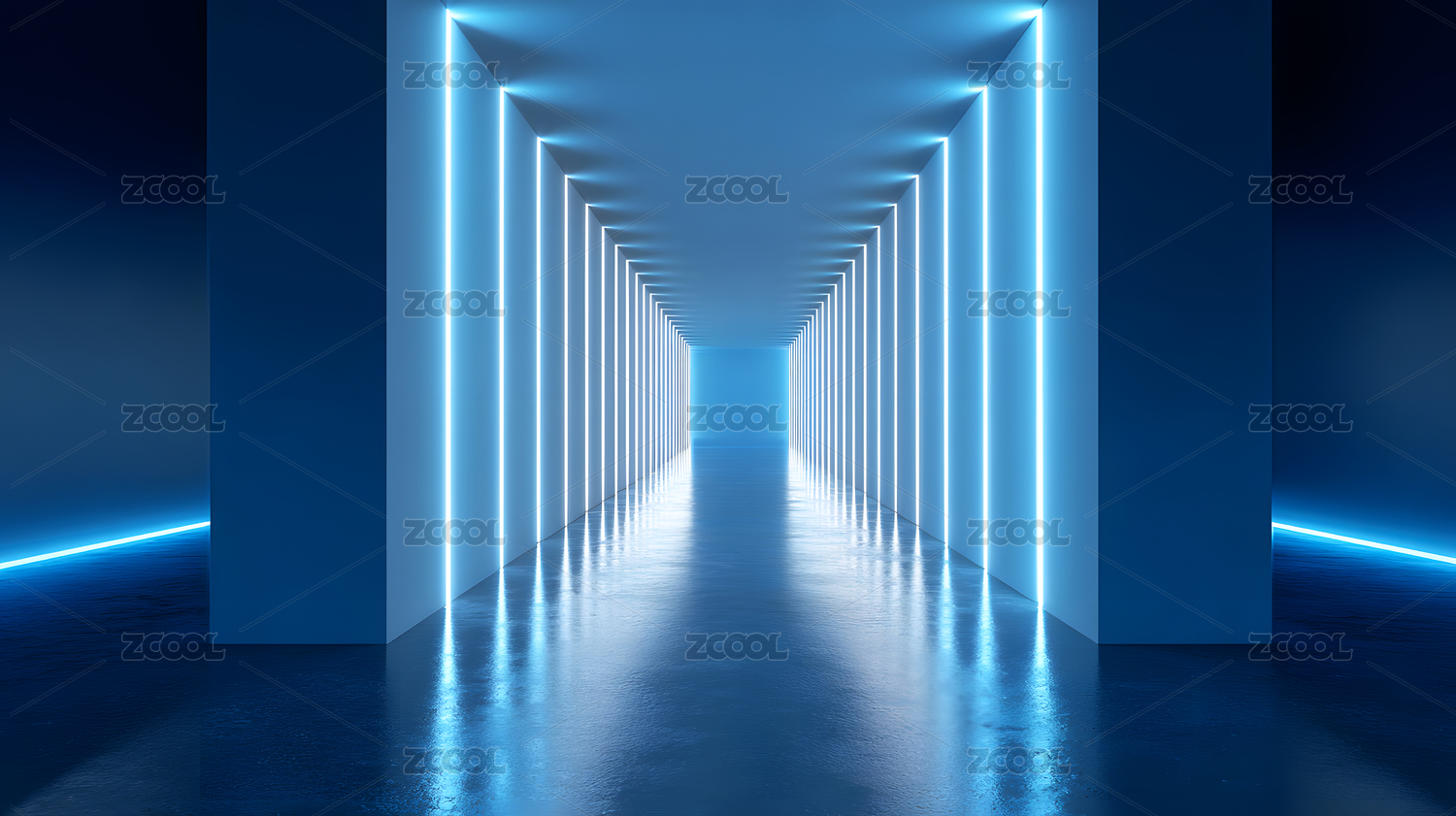 未来感深蓝色调与霓虹灯矩形框架室内场景