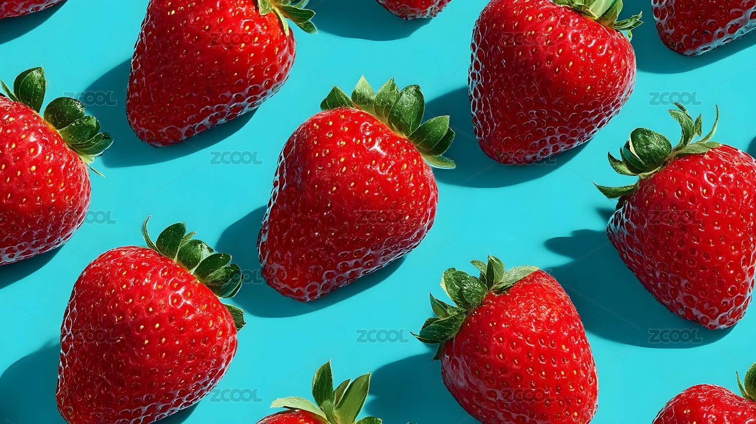 草莓,红色,绿色,果实,新鲜,排列,整齐,蓝色背景,水果,食物