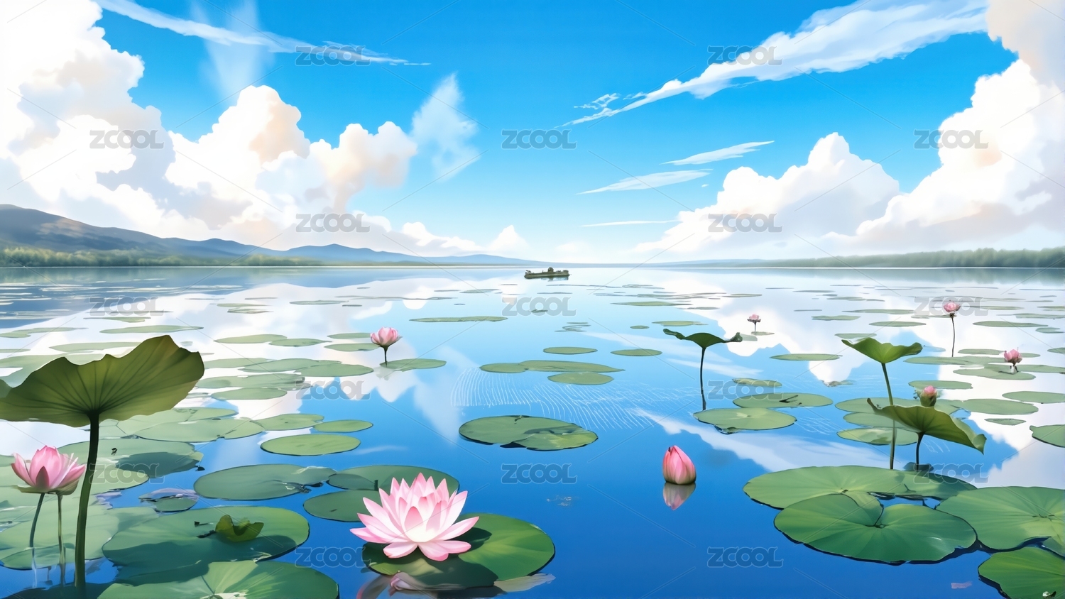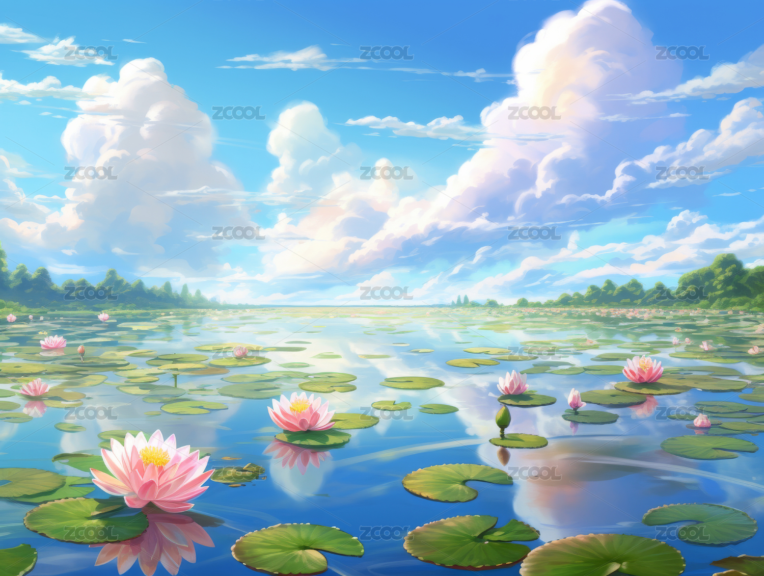 3d卡通夏天满荷叶荷花的池塘户外风景插画