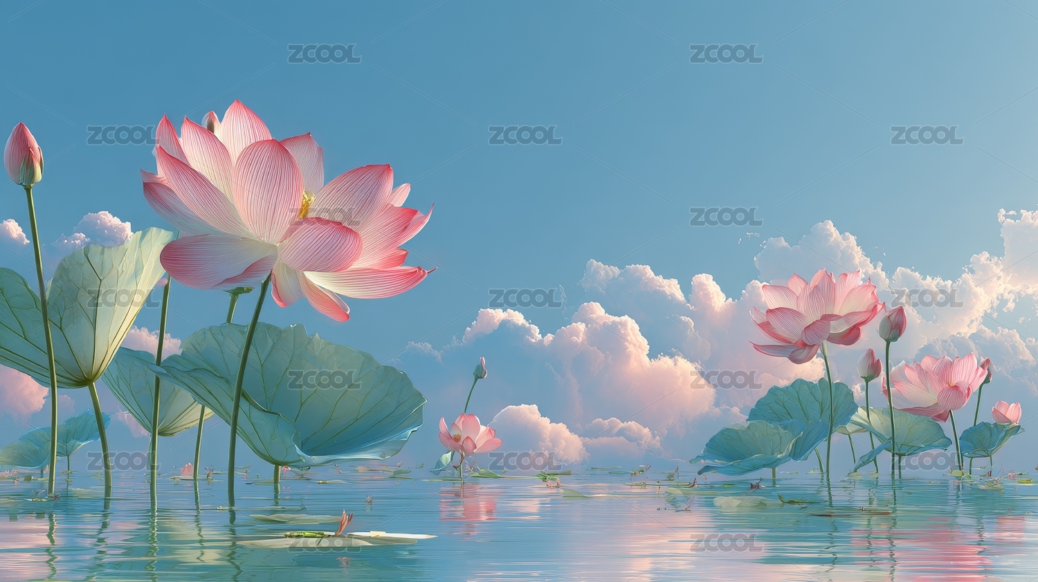 清新明亮有莲花流水的瑶池仙境3D立体插画