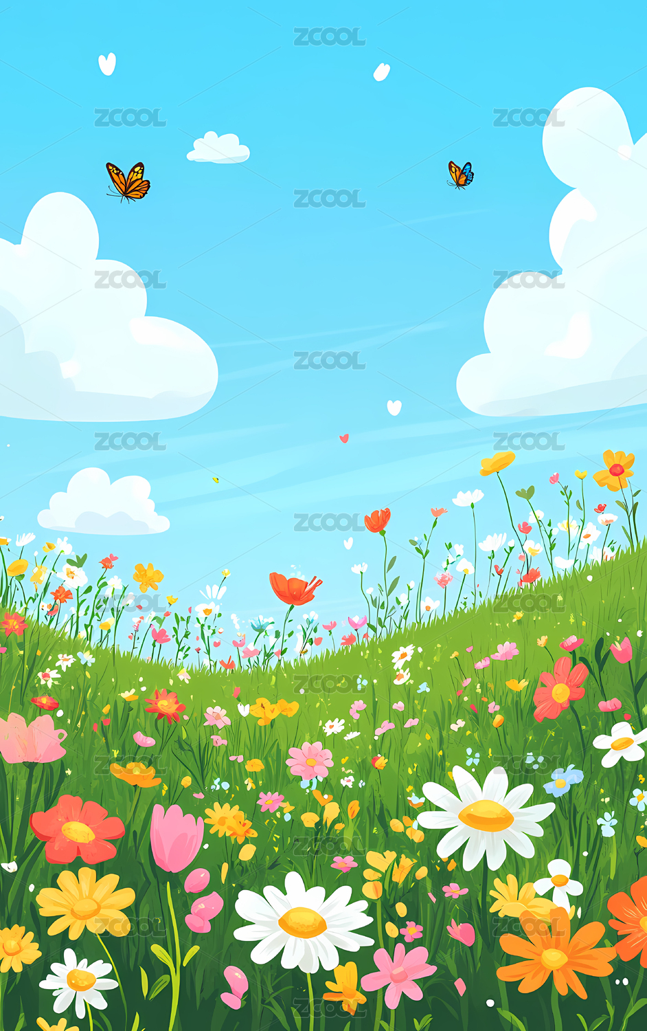 蝴蝶花丛飞舞图:多彩蝴蝶于粉花蓝天间灵动