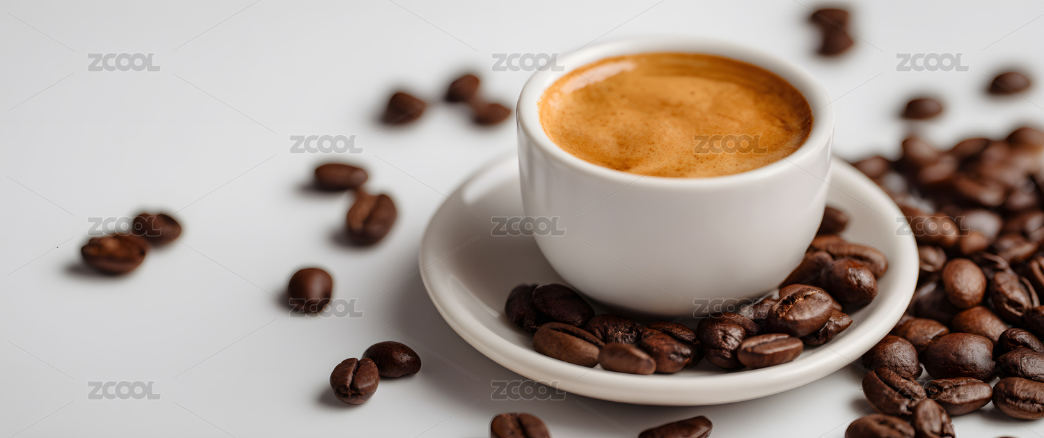 白色桌面上的咖啡与咖啡豆