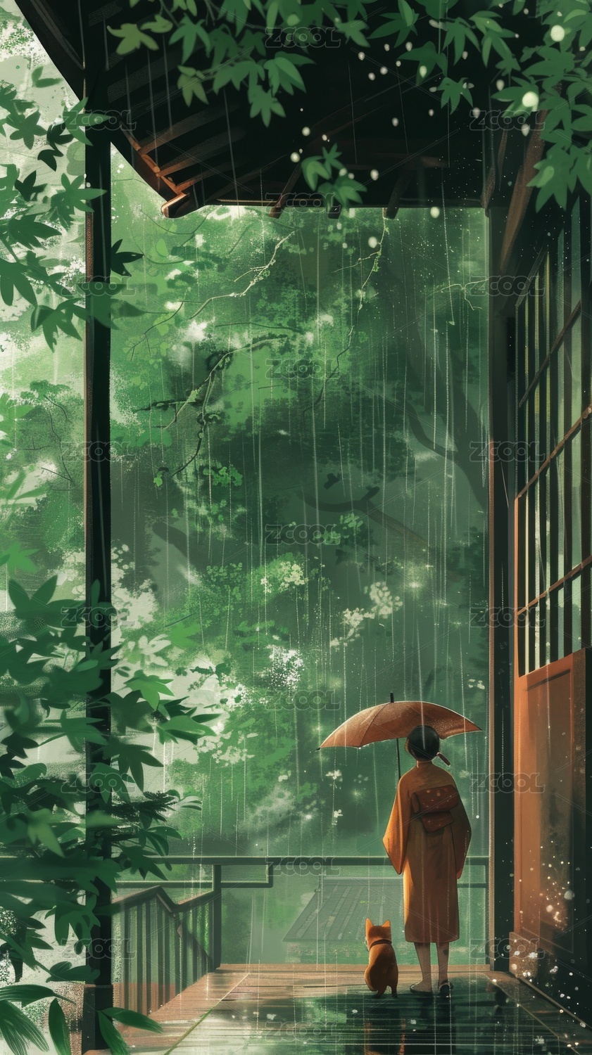 雨中绿叶房屋景色