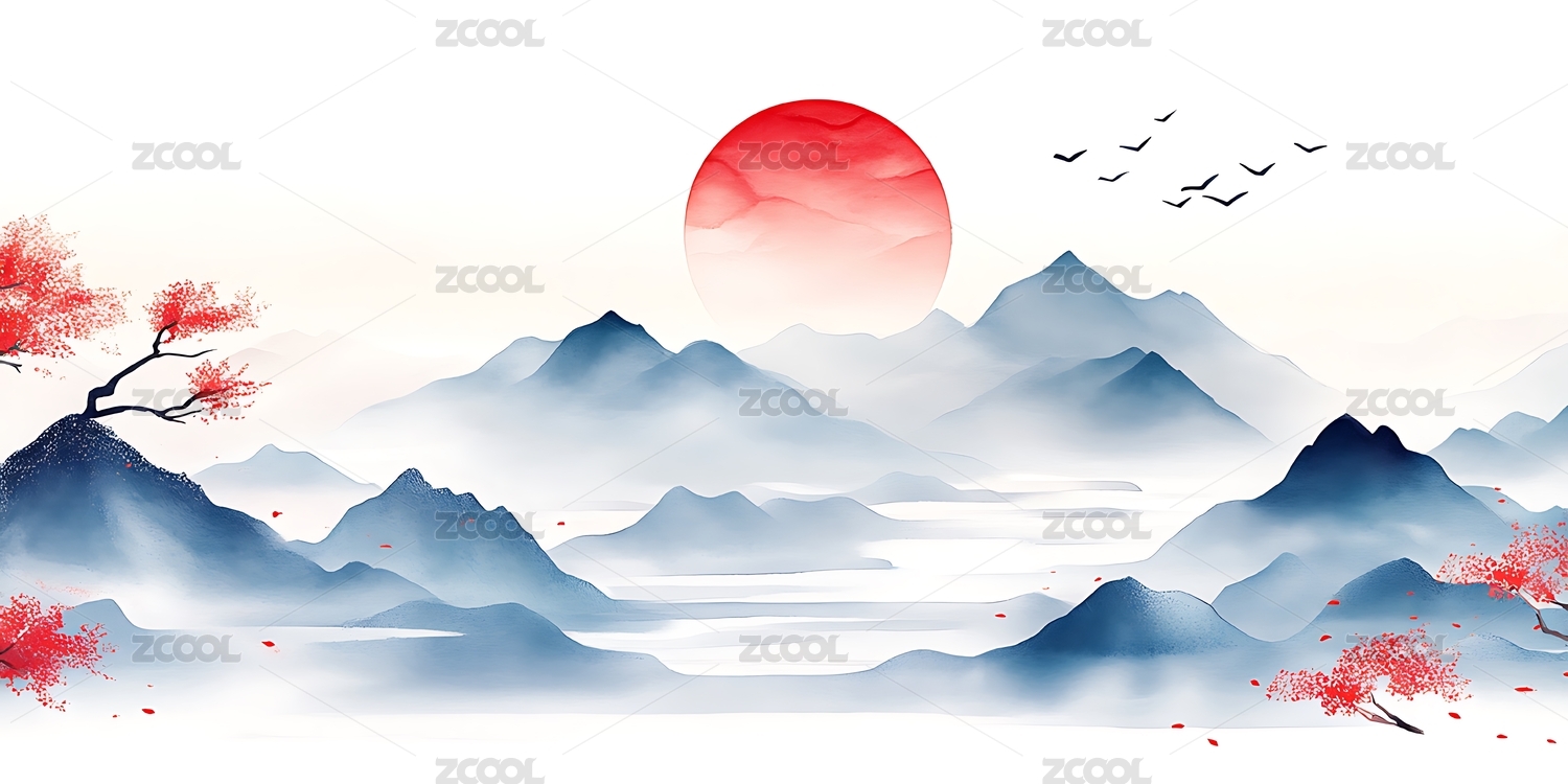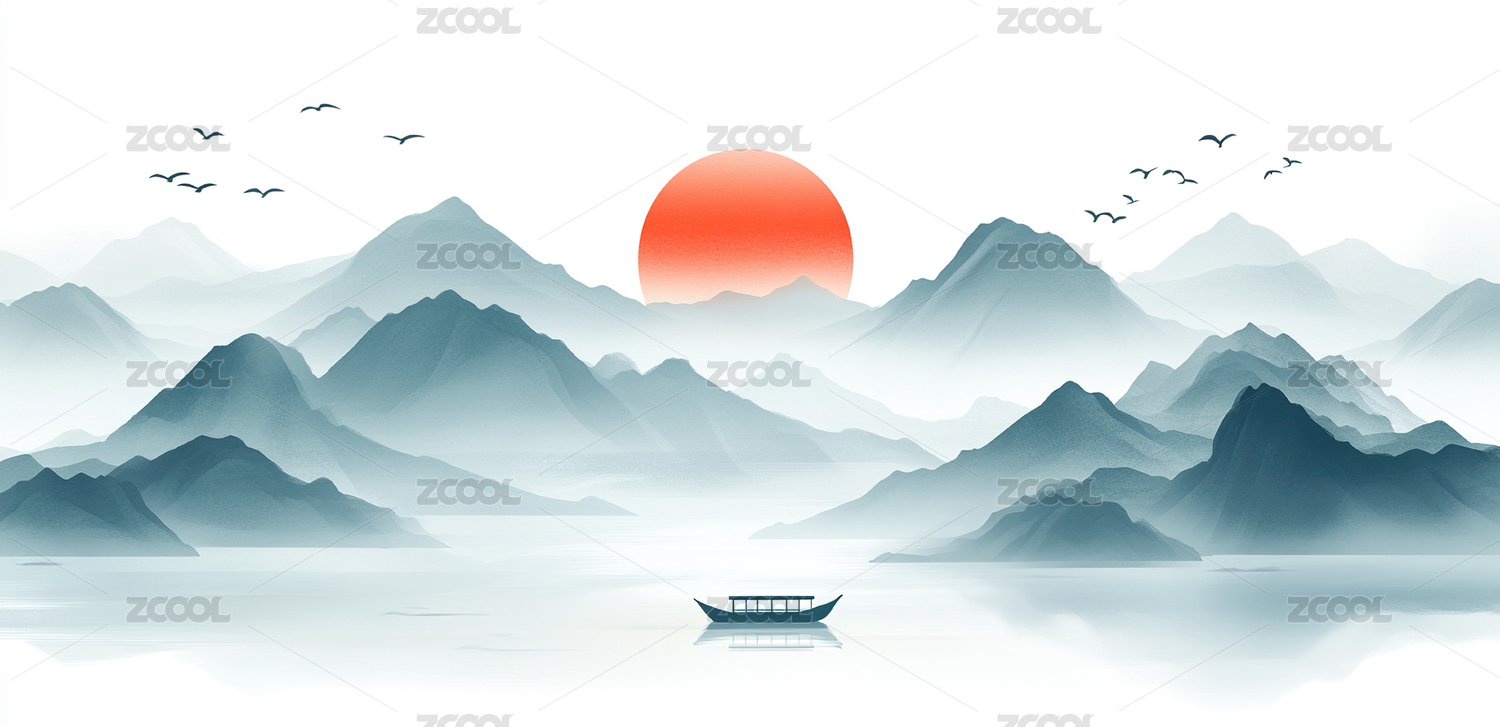 远山,山水,渔舟,梅花,中国风,装饰,日落,云彩,水墨,风景