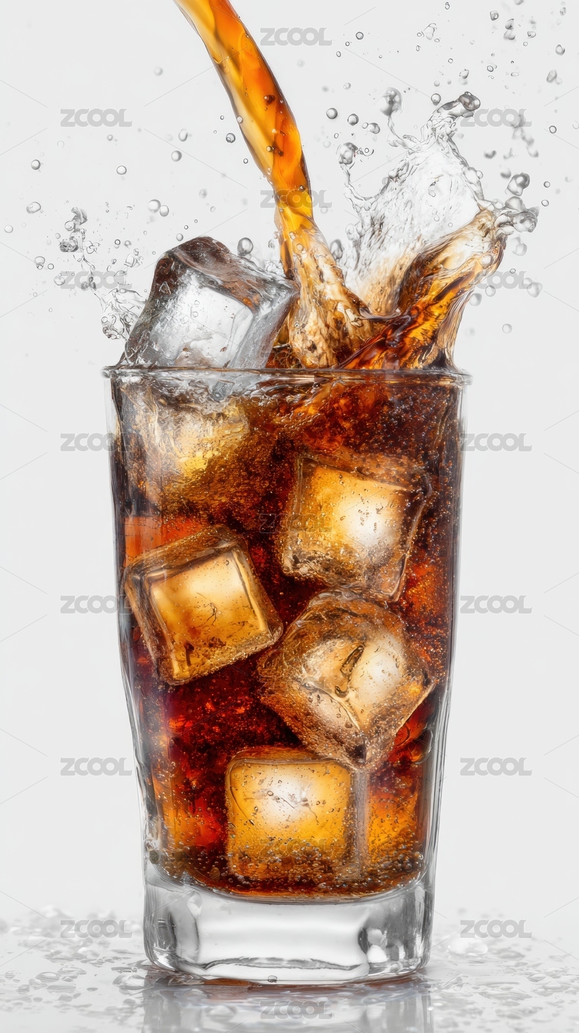 将可乐倒入一杯装有冰块的苏打水中高清图片