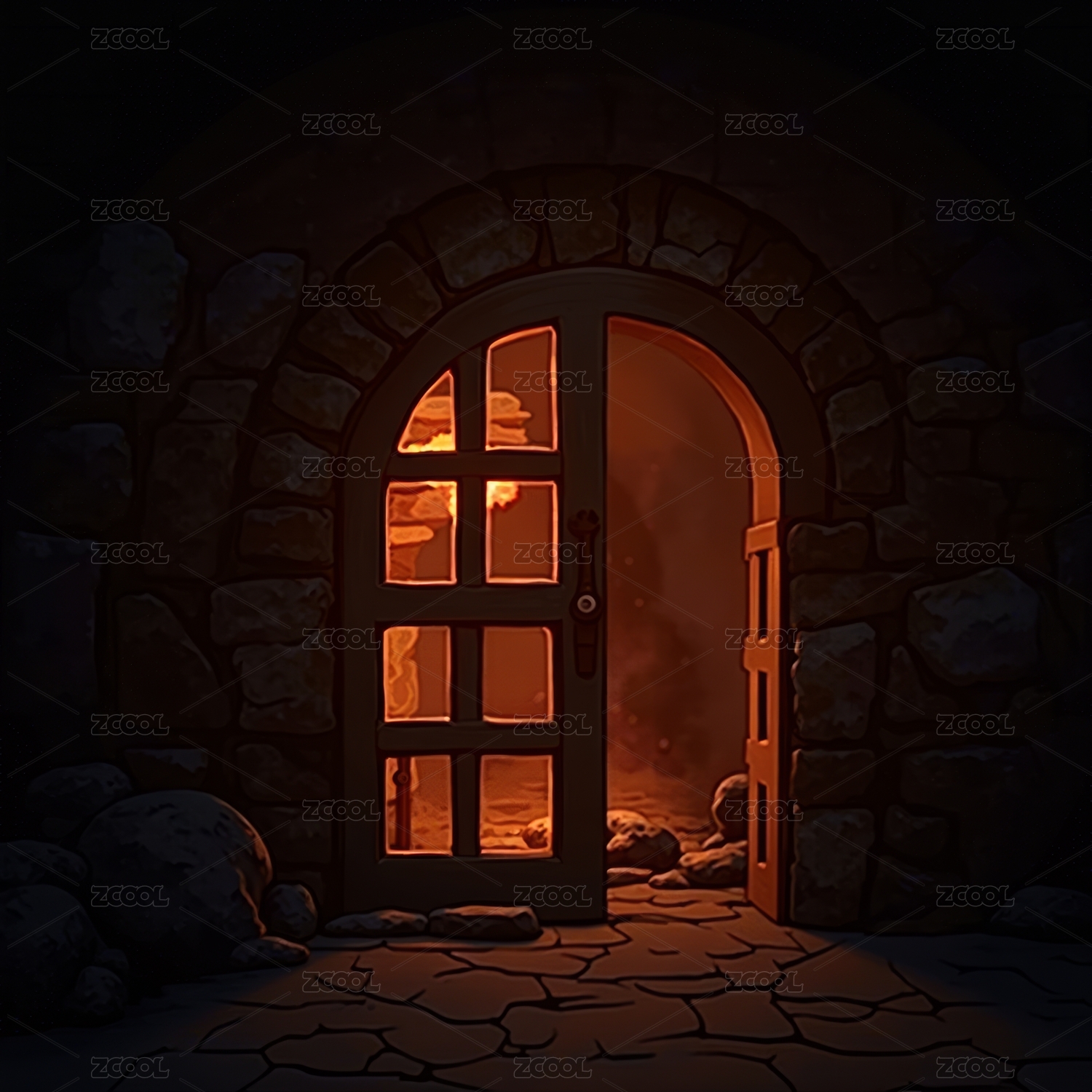 欧式复古城堡的拱形门窗外的绿色风景插画