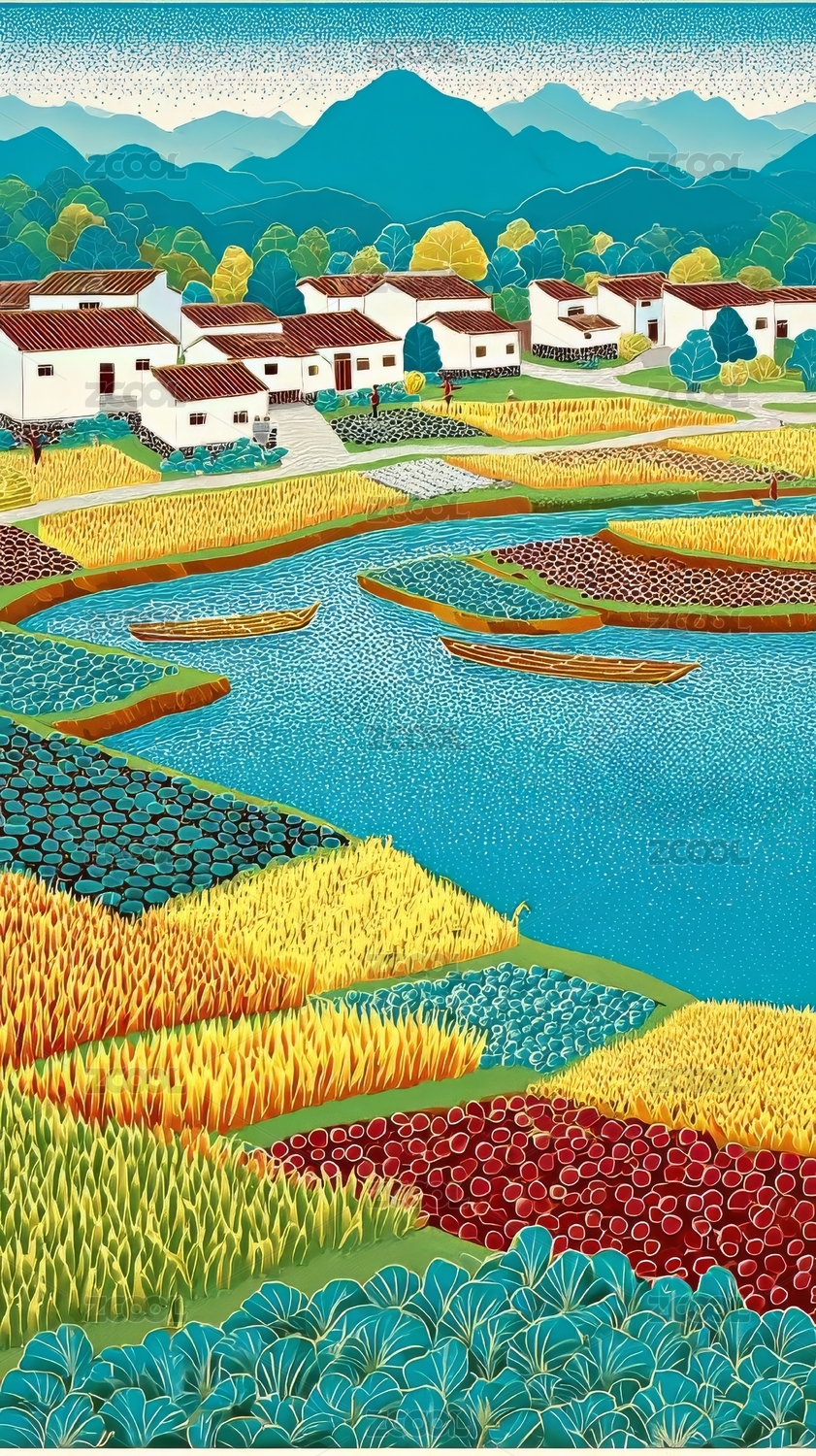 山水画,艺术,绘画,梦幻,蓝色,田园,乡村,花田,村庄,房屋