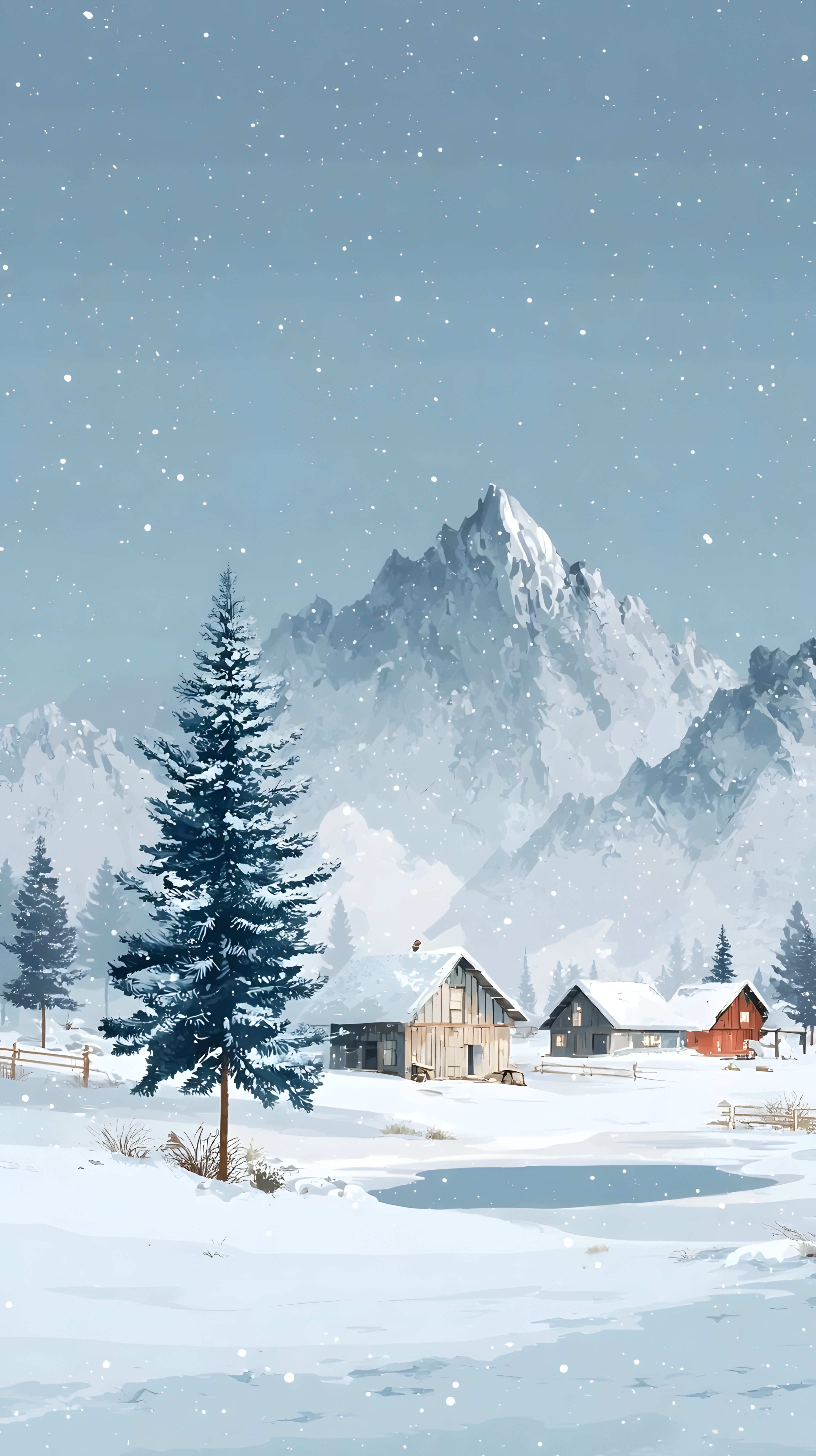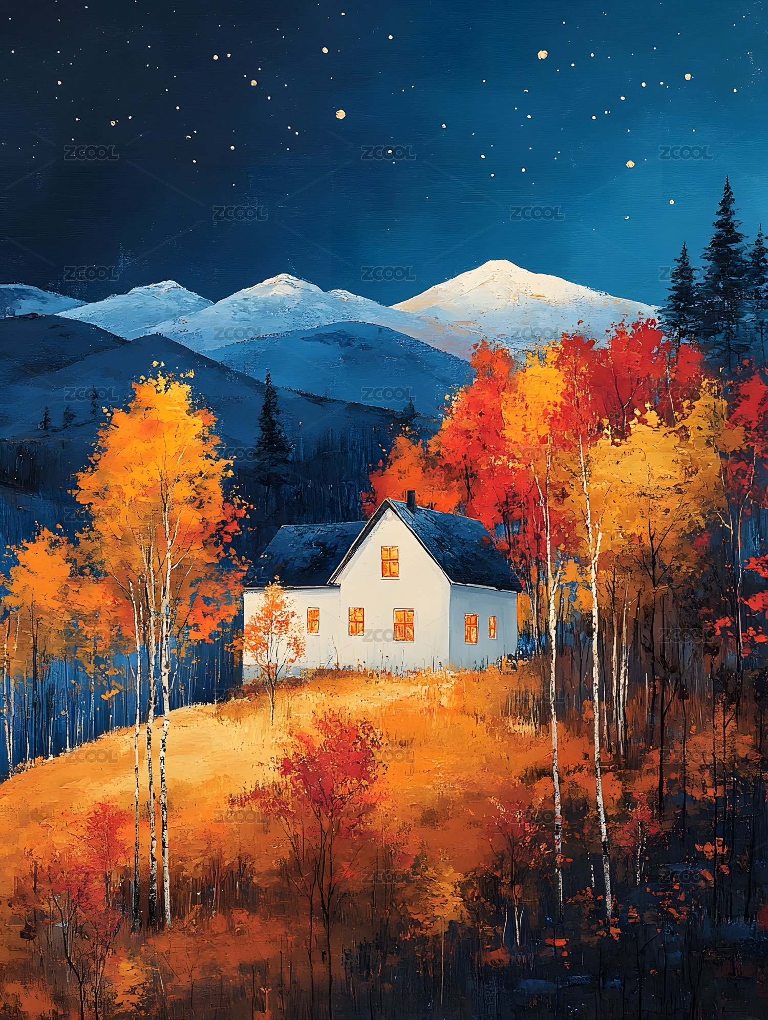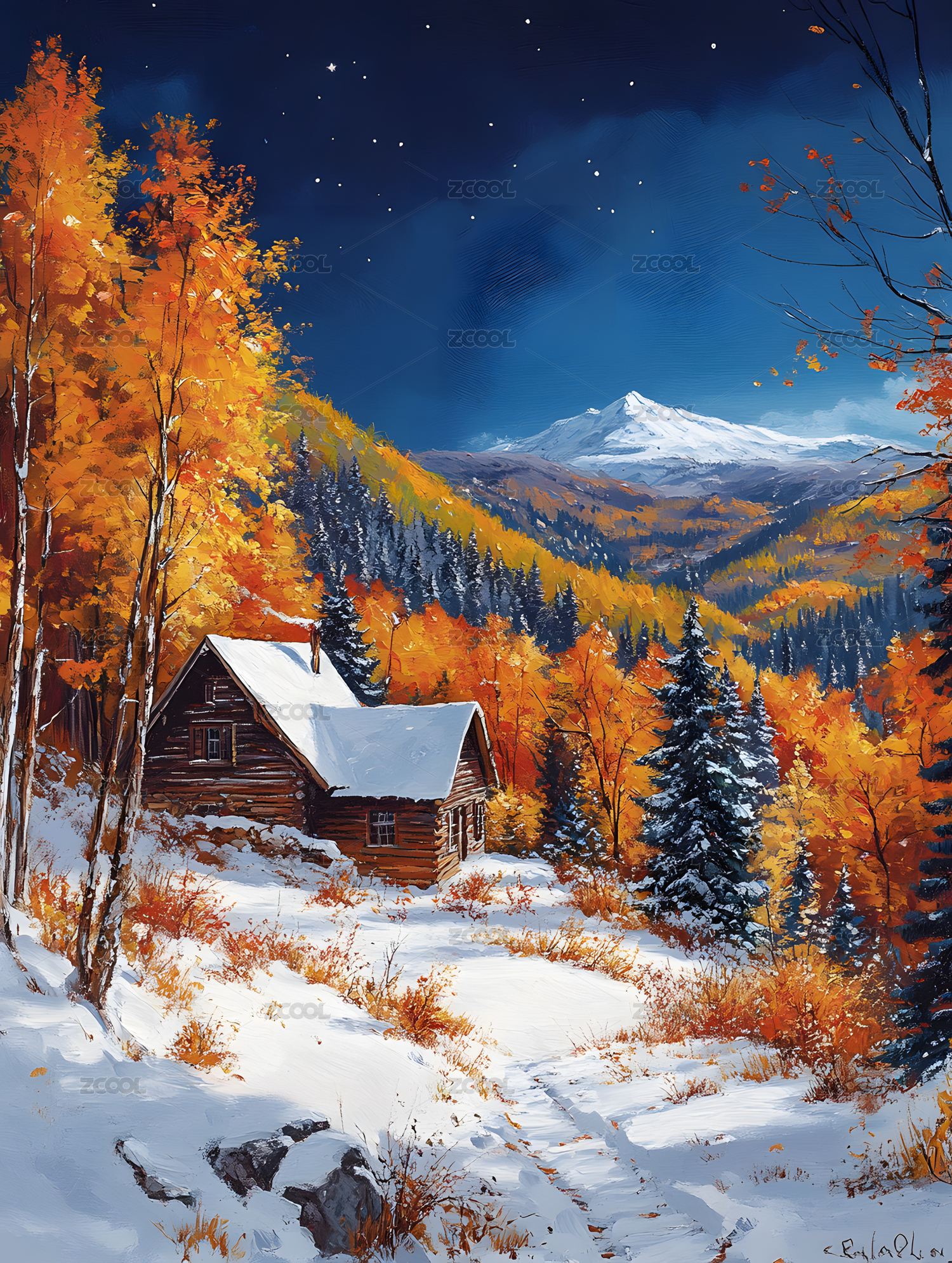 雪夜小木屋与雪山美景