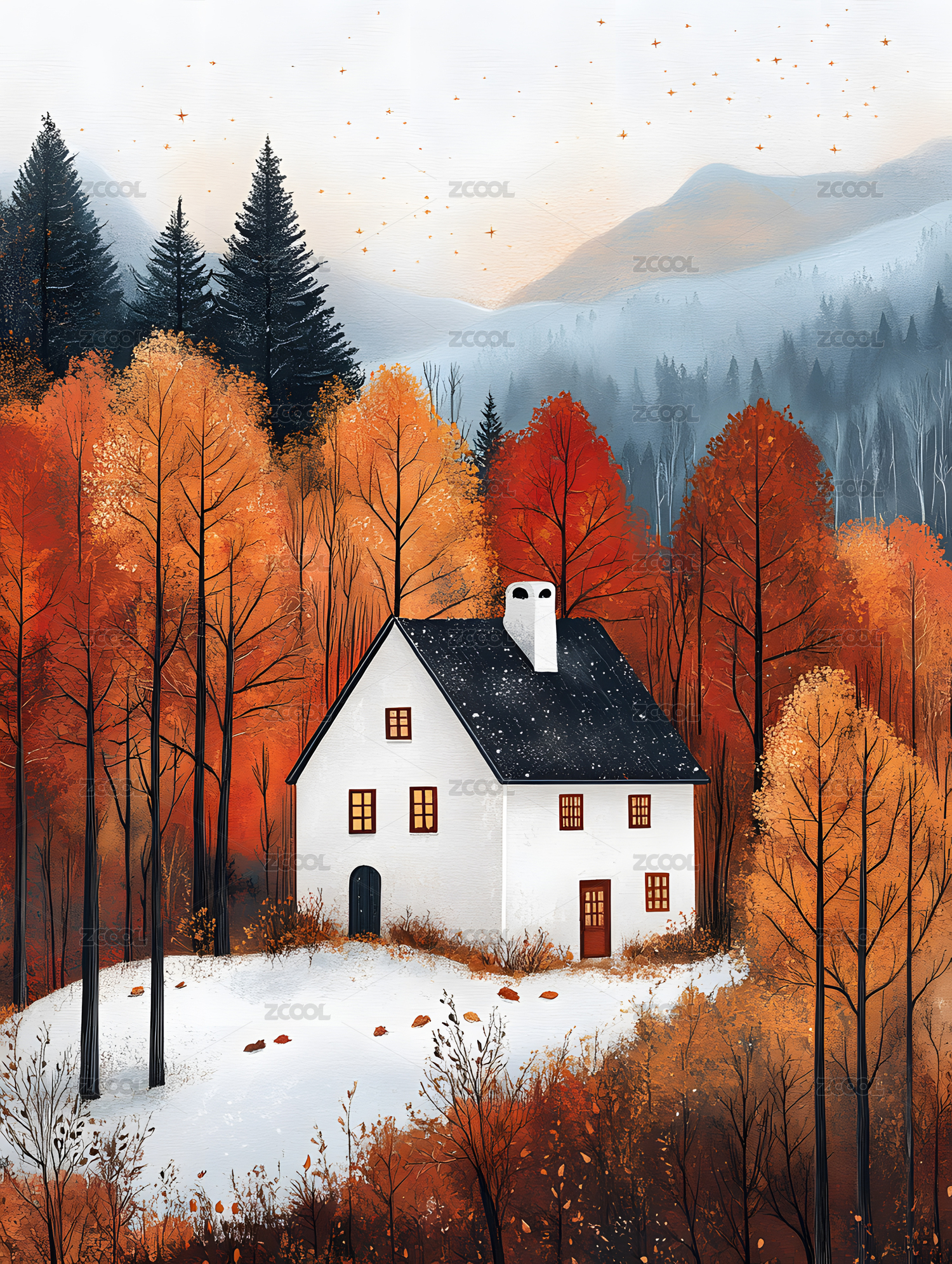 冬天雪花木屋建筑