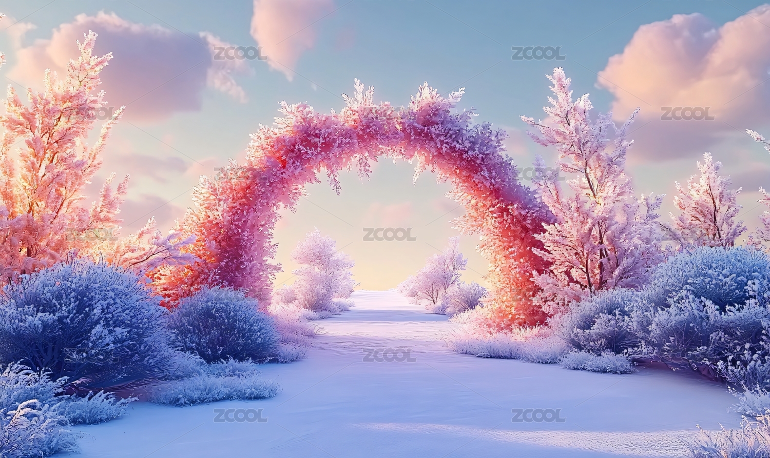 雪地树林雪景牌楼冬季3D插画