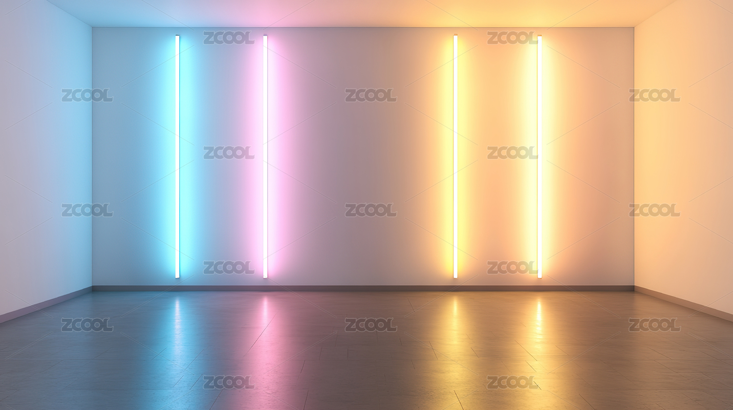 霓虹灯照亮空旷房间木地板映照出梦幻色彩
