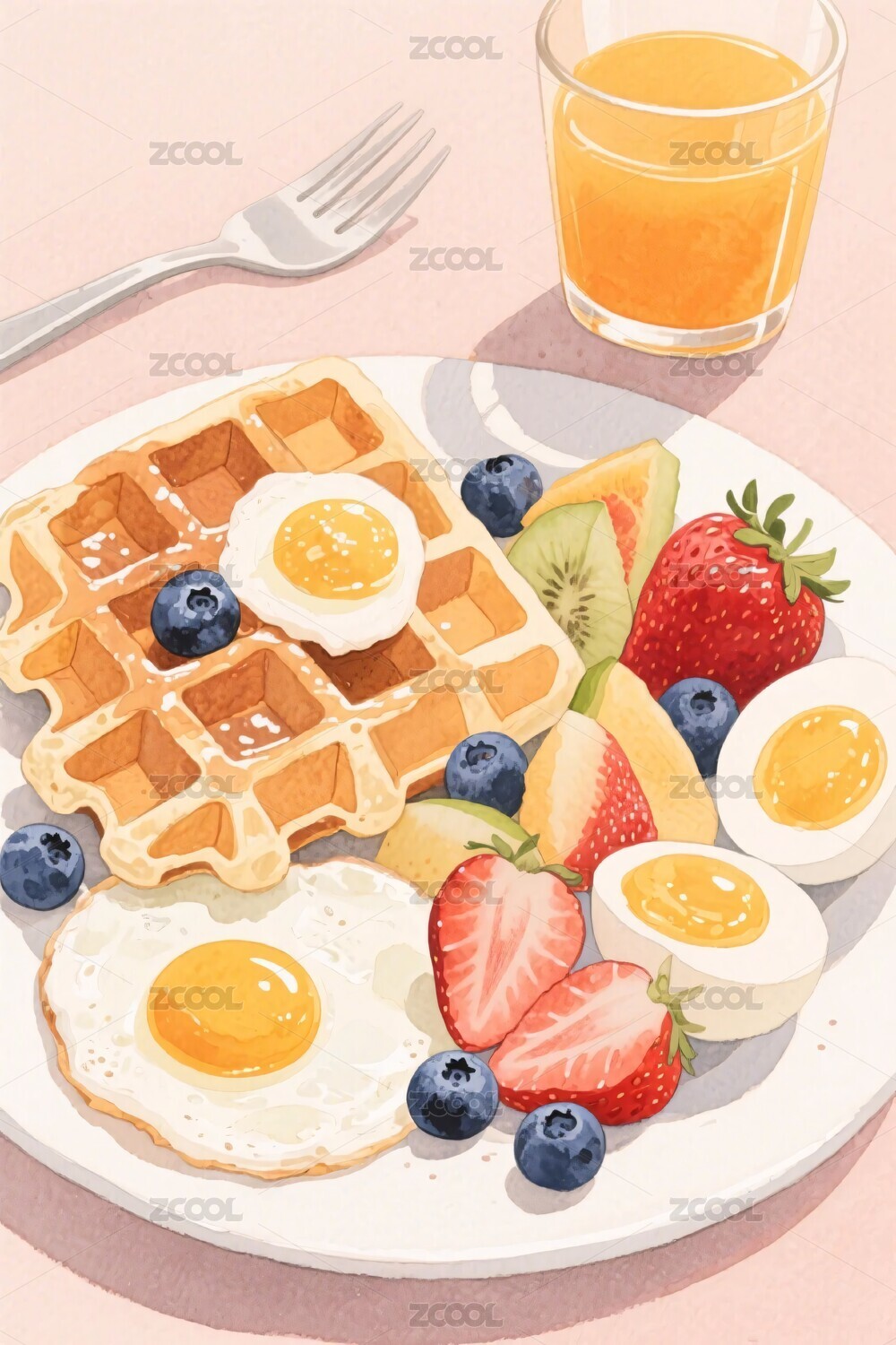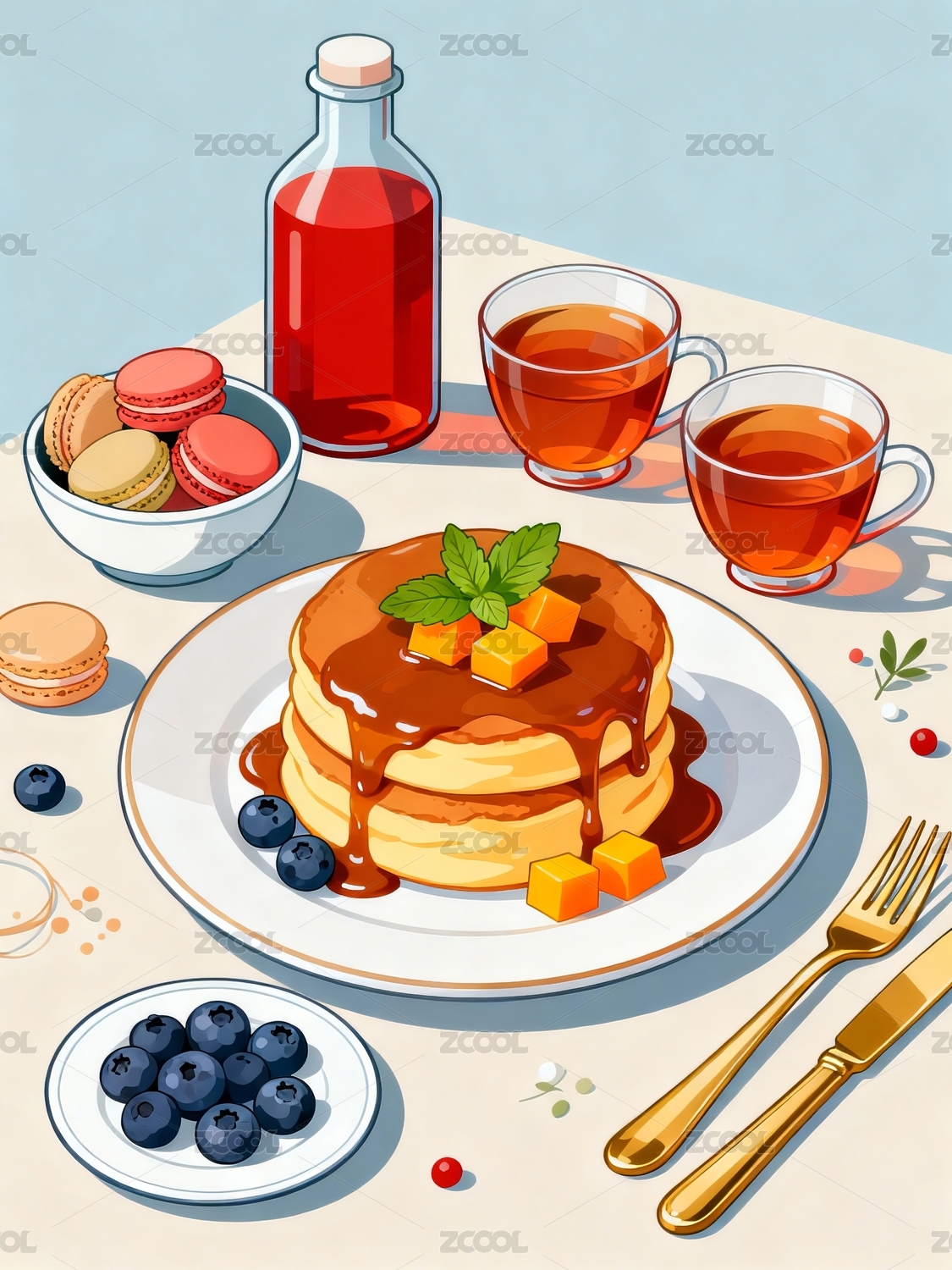华夫饼,蓝莓,糖浆,冰块,饮料,吸管,叉子,盘子,杯子,背景