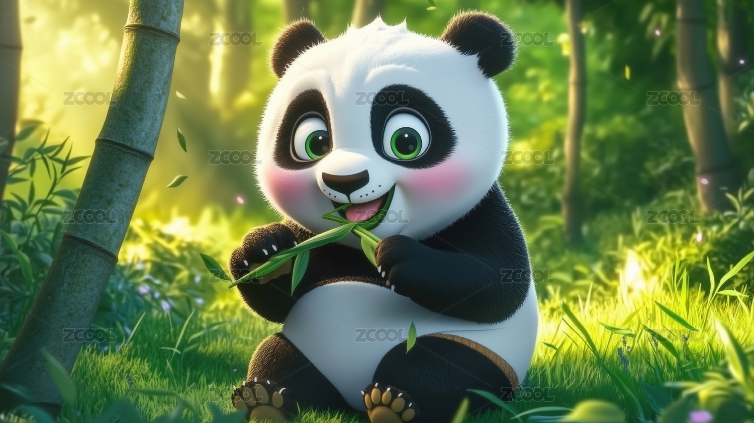在竹林里抱着竹子的大熊猫3D可爱卡通壁纸