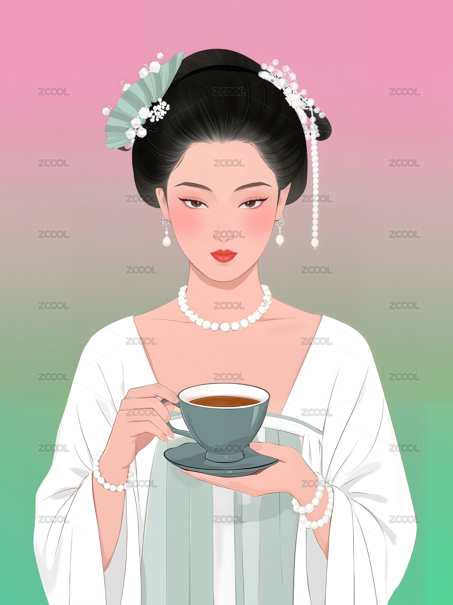 女性,发髻,项链,耳环,服饰,裙摆,插画,茶具,茶杯,热气