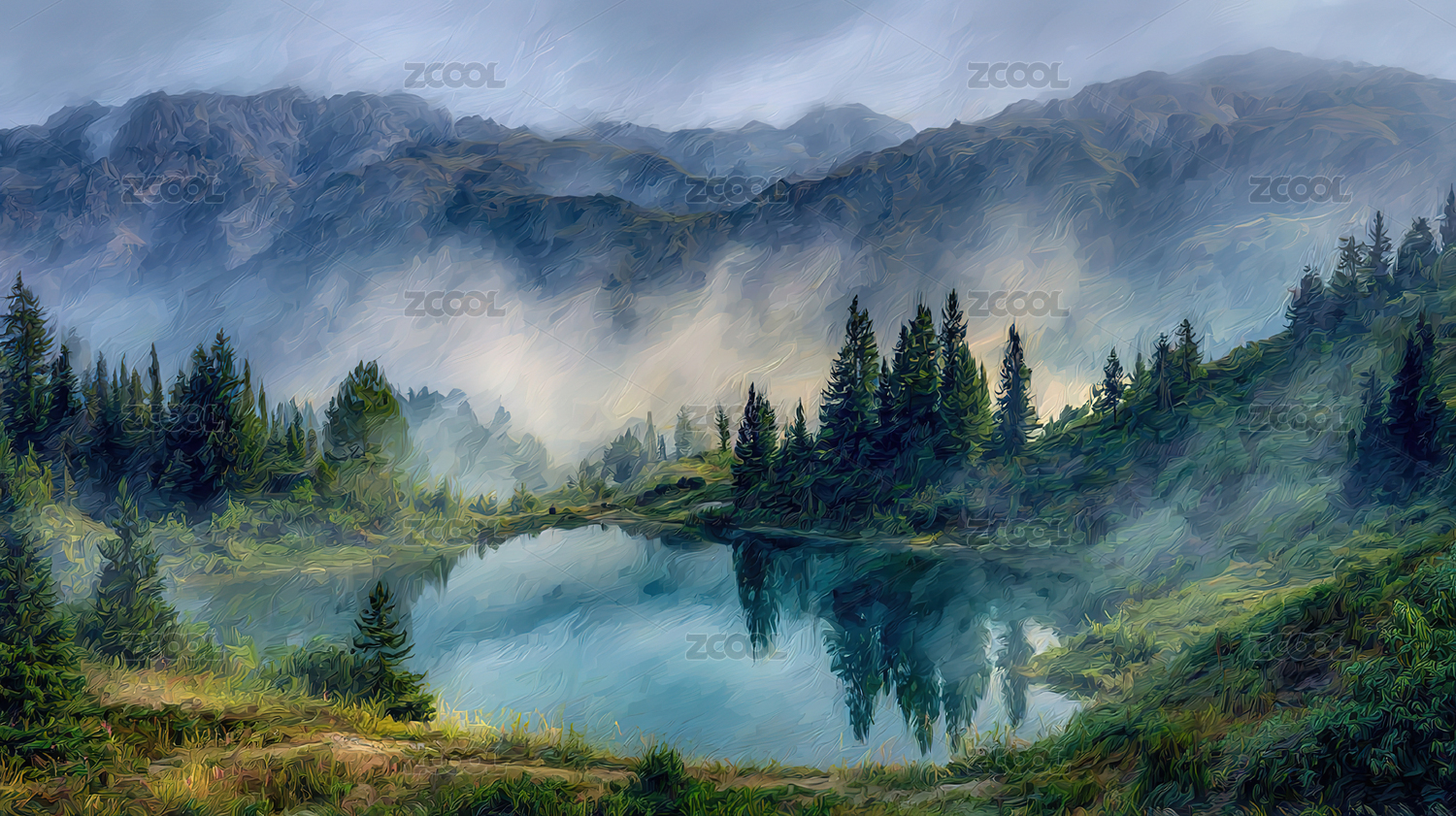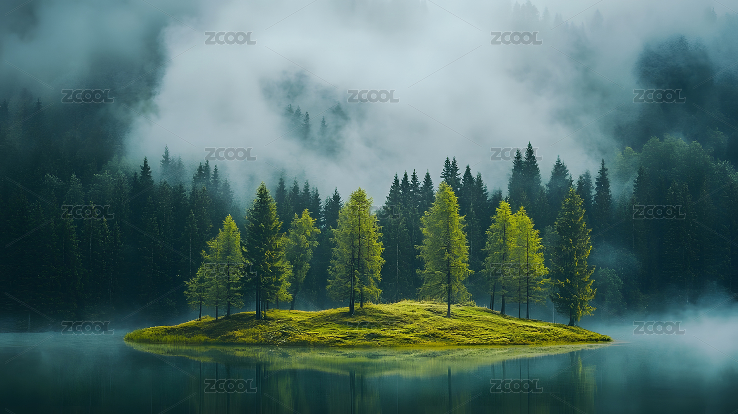 湖面,晨雾,松树,山峦,倒影,宁静,自然,风景,清晨,薄雾
