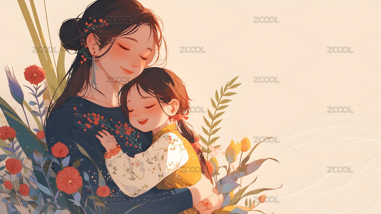 母亲和孩子相拥唯美温馨场景插画