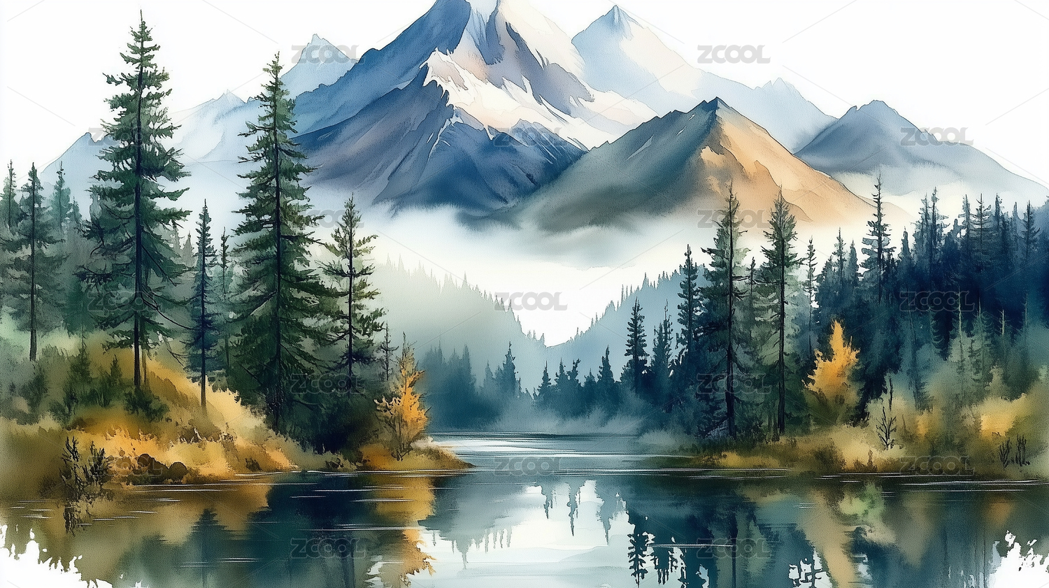 水彩风格森林湖泊风光